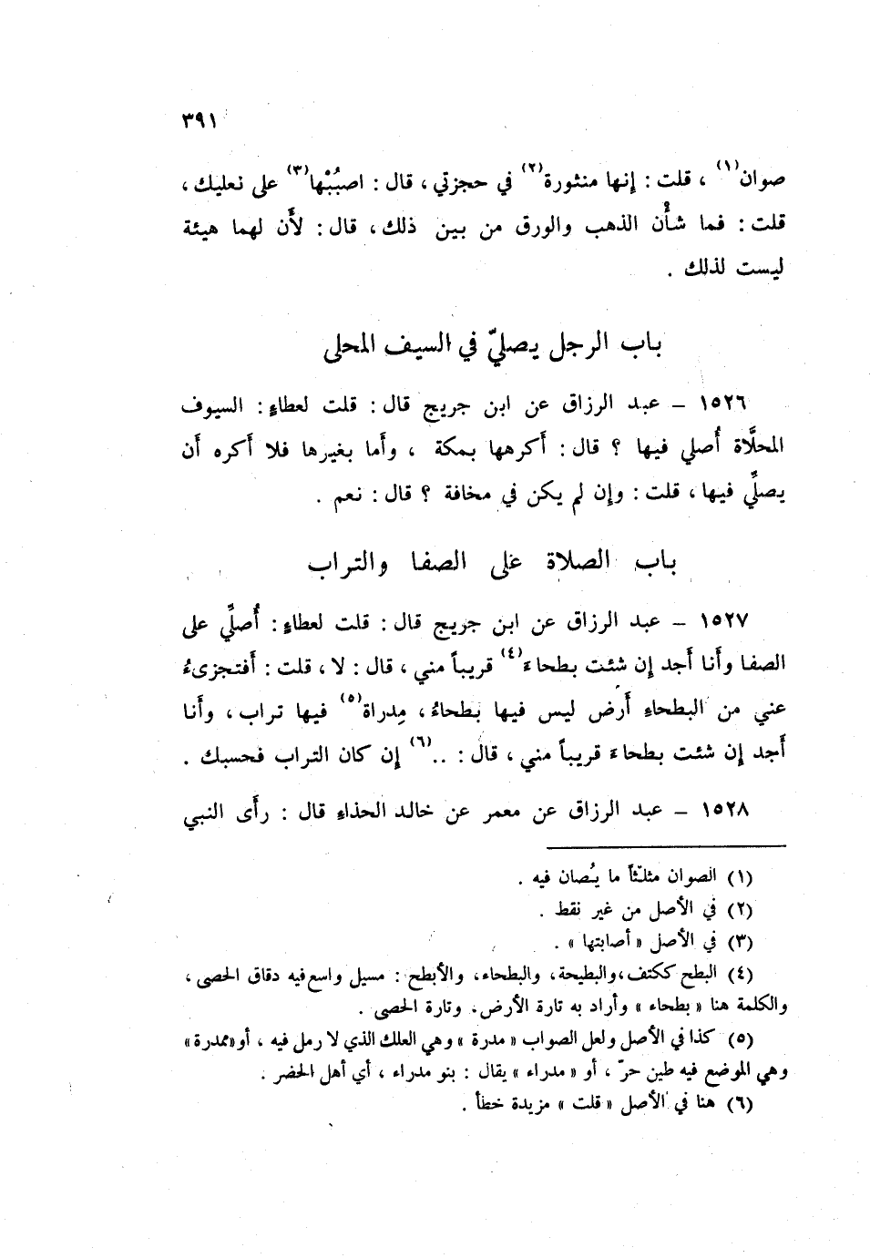 1526 - عَبْدُ الرَّزَّاقِ، عَنِ ابْنِ جُرَيْجٍ قَالَ: قُلْتُ لِعَطَاءٍ: §السُّيُوفُ الْمُحَلَّاةُ أُصَلِّي فِيهَا؟ قَالَ: «أَكْرَهُهَا بِمَكَّةَ، وَأَمَّا بِغَيْرِهَا فَلَا أَكْرَهُ أَنْ يُصَلِّيَ فِيهَا»، قُلْتُ: وَإِنْ لَمْ يَكُنْ فِي مَخَافَةٍ؟ قَالَ: «نَعَمْ»
