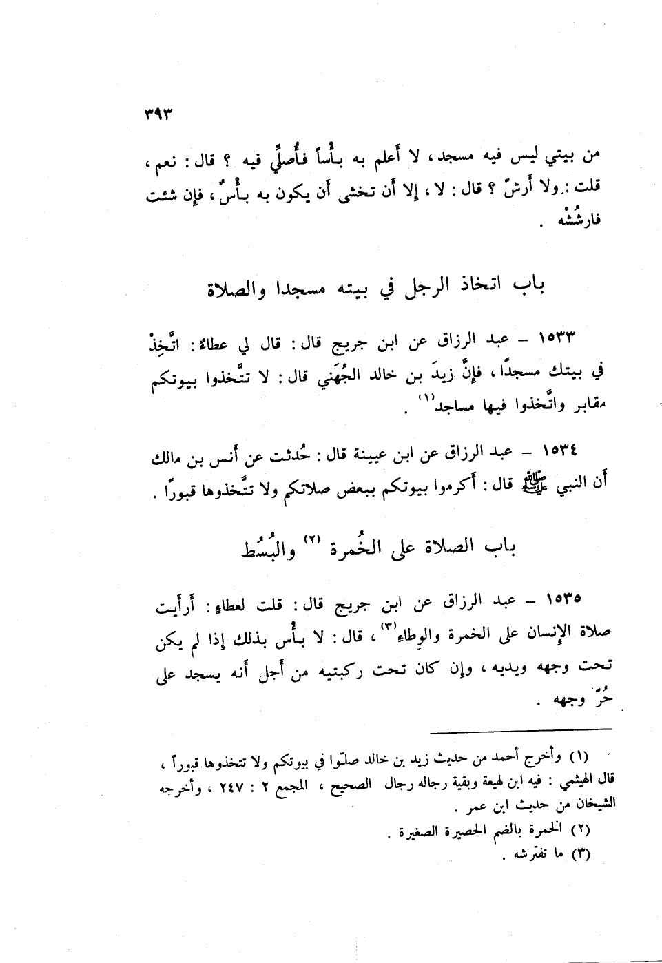 1533 - عَبْدُ الرَّزَّاقِ، عَنِ ابْنِ جُرَيْجٍ قَالَ: قَالَ لِي عَطَاءٌ: اتَّخِذْ فِي بَيْتِكَ مَسْجِدًا، فَإِنَّ زَيْدَ بْنَ خَالِدٍ الْجُهَنِيَّ قَالَ: «§لَا تَتَّخِذُوا بُيُوتَكُمْ مَقَابِرَ، وَاتخِذُوا فِيهَا مَسَاجِدَ»