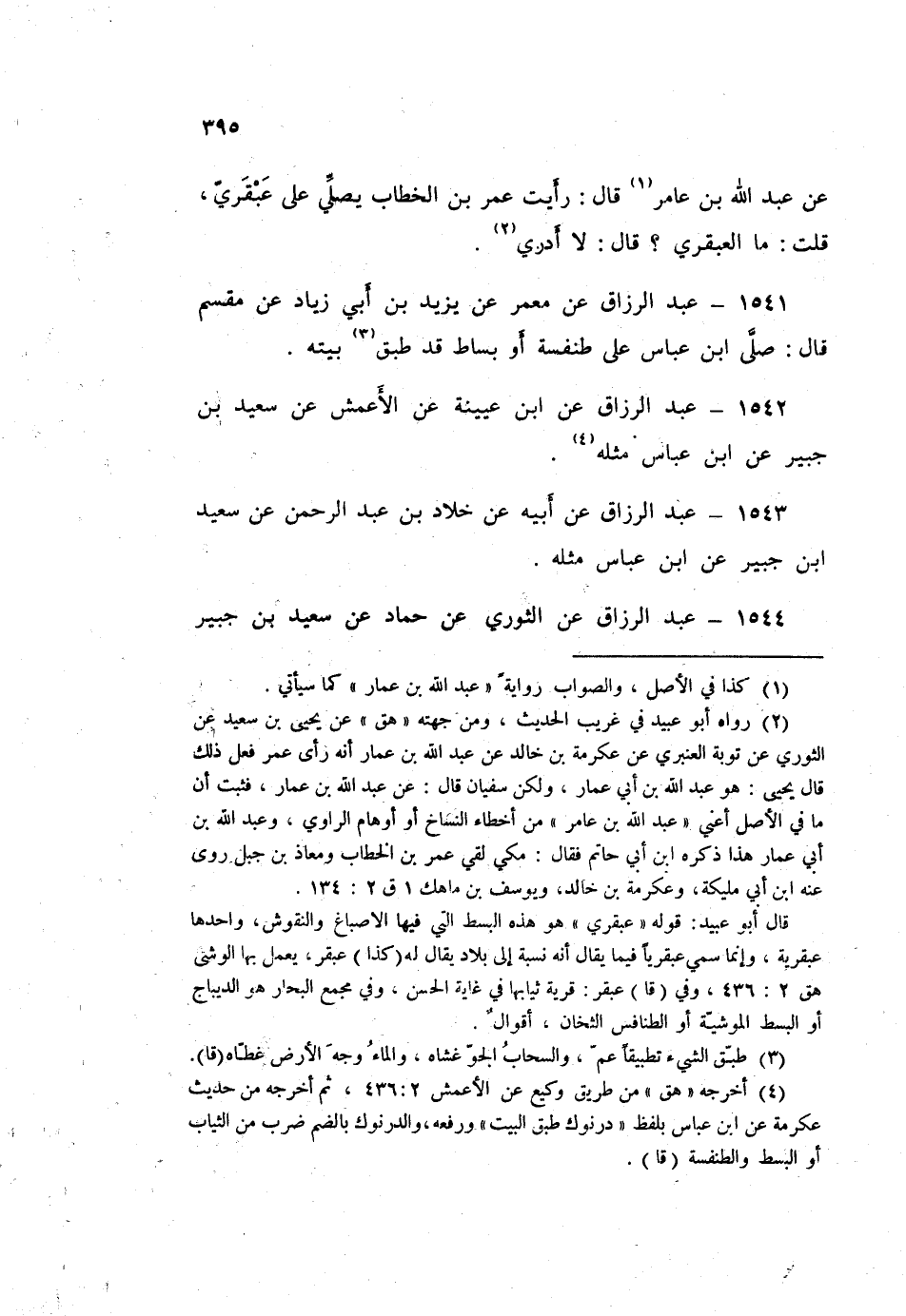 1544 - عَبْدُ الرَّزَّاقِ، عَنِ الثَّوْرِيِّ، عَنْ حَمَّادٍ، عَنْ سَعِيدِ بْنِ جُبَيْرٍ قَالَ: «§صَلَّى ابْنُ عَبَّاسٍ عَلَى طَنْفَسَةٍ طَبَّقَ الْبَيْتَ»
