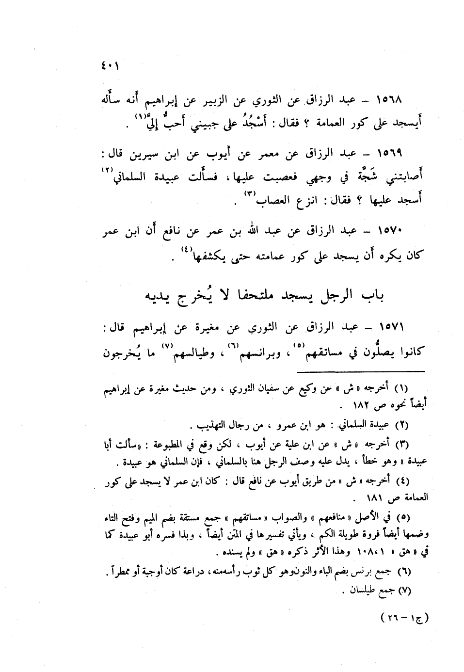 1570 - عَبْدُ الرَّزَّاقِ، عَنْ عَبْدِ اللَّهِ بْنِ عُمَرَ، عَنْ نَافِعٍ، أَنَّ ابْنَ عُمَرَ: «كَانَ §يَكْرَهُ أَنْ يَسْجُدَ عَلَى كَوْرِ عِمَامَتِهِ حَتَّى يَكْشِفَهَا»
