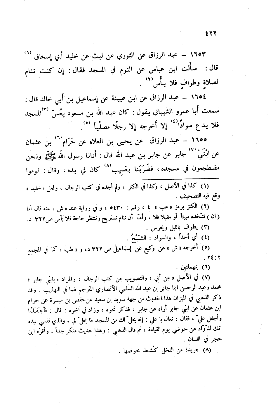 1655 - عَبْدُ الرَّزَّاقِ، عَنْ يَحْيَى بْنِ الْعَلَاءِ، عَنْ حَرَامِ بْنِ عُثْمَانَ، عَنِ ابْنَيْ جَابِرٍ، عَنْ جَابِرِ بْنِ عَبْدِ اللَّهِ قَالَ: أَتَانَا رَسُولُ اللَّهِ صَلَّى اللهُ عَلَيْهِ وَسَلَّمَ وَنَحْنُ مُضْطَجِعُونَ فِي مَسْجِدِهِ فَضَرَبَنَا بِعَسِيبٍ كَانَ فِي يَدِهِ، وَقَالَ: «§قُوَمُوا لَا تَرْقُدُوا فِي الْمَسْجِدِ»