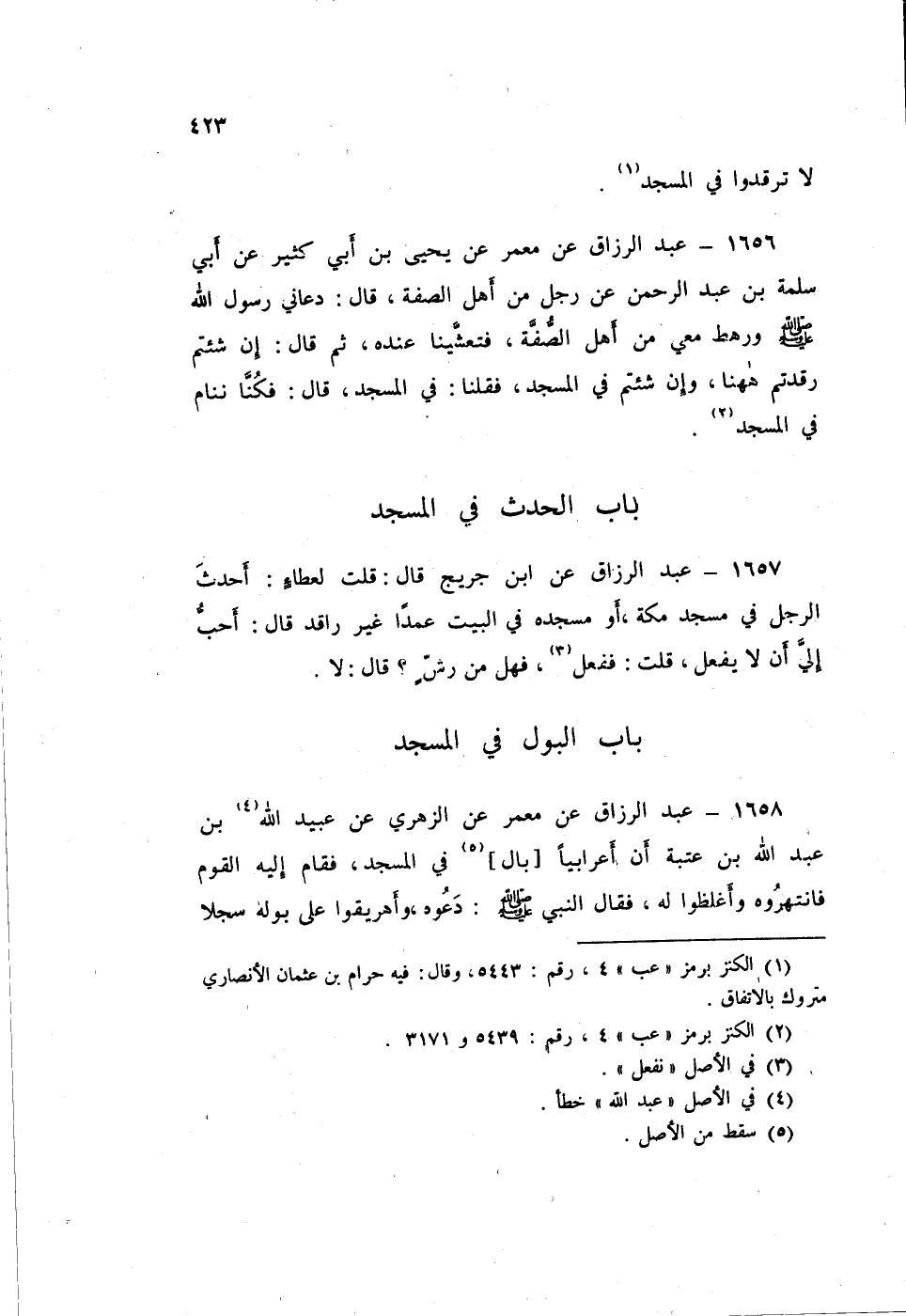 1658 - عَبْدُ الرَّزَّاقِ، عَنْ مَعْمَرٍ، عَنِ الزُّهْرِيِّ، عَنْ عُبَيْدِ اللَّهِ بْنِ عَبْدِ اللَّهِ بْنِ عُتْبَةَ، أَنَّ أَعْرَابِيًّا بَالَ فِي الْمَسْجِدِ فَقَامَ إِلَيْهِ الْقَوْمُ فَانْتَهَرُوهُ، وَأَغْلَظُوا لَهُ، فَقَالَ النَّبِيُّ صَلَّى اللهُ عَلَيْهِ وَسَلَّمَ: «§دَعُوهُ، وَأَهْرِيقُوا عَلَى بَوْلِهِ سِجِلًّا مِنْ مَاءٍ - أَوْ دَلْوًا مِنْ مَاءٍ -، فَإِنَّمَا بُعِثْتُمْ مُيَسِّرِينَ، وَلمْ تُبْعَثُوا مُعَسِّرِينَ»، ثُمَّ قَامَ النَّبِيُّ صَلَّى اللهُ عَلَيْهِ وَسَلَّمَ، وَالْأعْرَابِيُّ خَلْفَهُ فَبَيْنَا هُمْ يُصَلُّونَ إِذْ قَالَ الْأعْرَابِيُّ: اللَّهُمُ ارْحَمْنِي، وَمُحَمَّدًا، وَلَا تَرْحَمْ مَعَنَا أَحَدًا، فَلَمَّا انْصَرَفَ رَسُولُ اللَّهِ صَلَّى اللهُ عَلَيْهِ وَسَلَّمَ قَالَ لَهُ: «لَقَدْ تَحَجَّرْتَ وَاسِعًا»