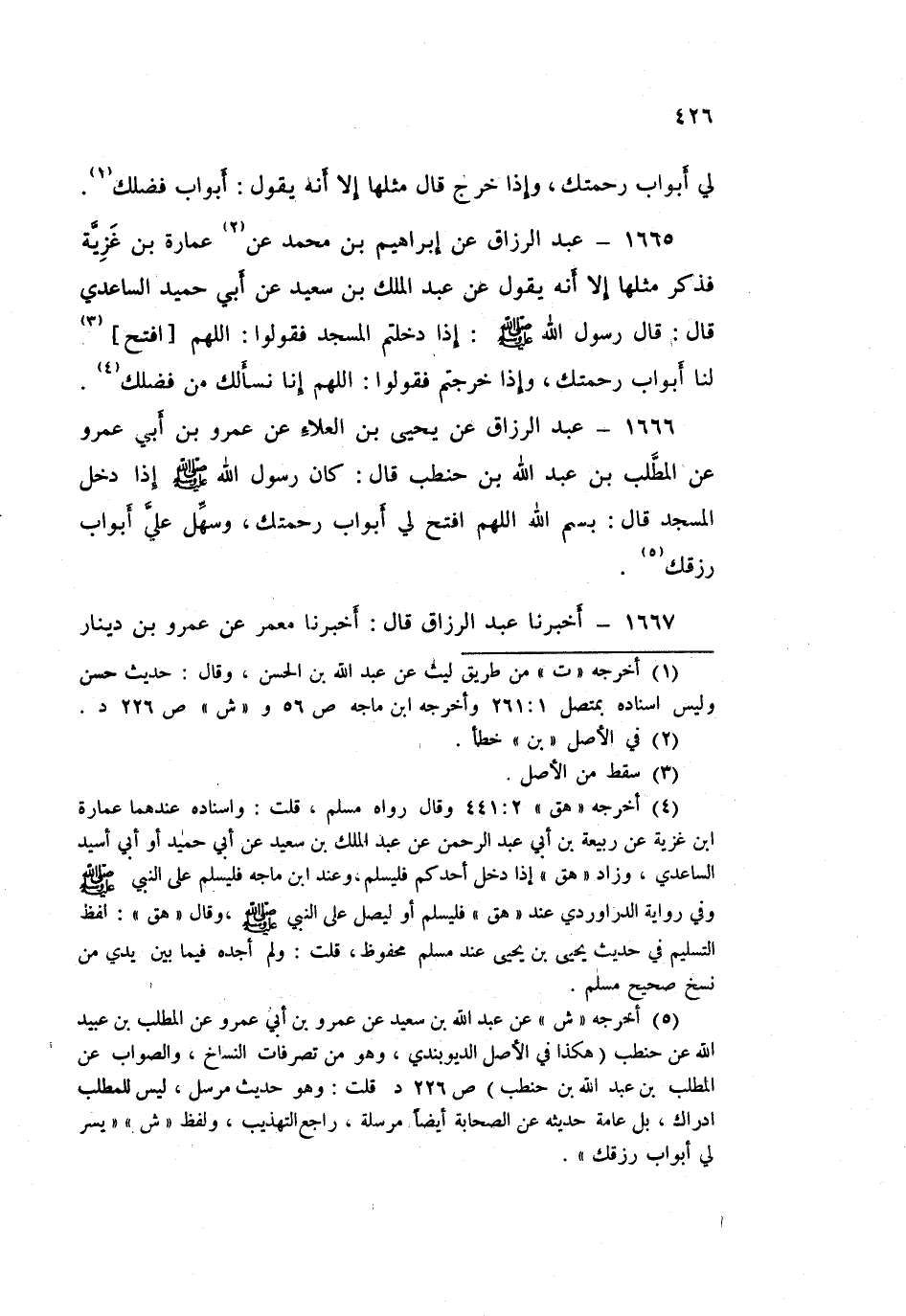 1666 - عَبْدُ الرَّزَّاقِ، عَنْ يَحْيَى بْنِ الْعَلَاءِ، عَنْ عَمْرِو بْنِ أَبِي عَمْرٍو، عَنِ الْمُطَّلِبِ بْنِ عَبْدِ اللَّهِ بْنِ حَنْطَبٍ قَالَ: كَانَ رَسُولُ اللَّهِ صَلَّى اللهُ عَلَيْهِ وَسَلَّمَ إِذَا دَخَلَ الْمَسْجِدَ قَالَ: «§بِسْمِ اللَّهِ اللَّهُمُ افْتَحْ لِي أَبْوَابَ رَحْمَتِكَ، وَسَهِّلْ عَلَيَّ أَبْوَابَ رِزْقِكَ»