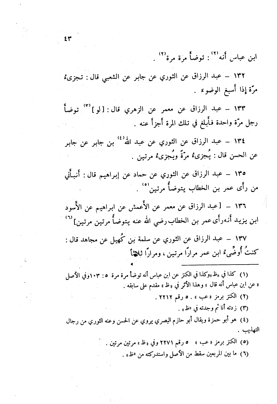 135 - عَبْدُ الرَّزَّاقِ، عَنِ الثَّوْرِيِّ، عَنْ حَمَّادٍ، عَنْ إِبْرَاهِيمَ قَالَ: أَنْبَأَنِي مَنْ رَأَى، عُمَرَ بْنَ الْخَطَّابِ «§يَتَوَضَّأُ مَرَّتَيْنِ»
