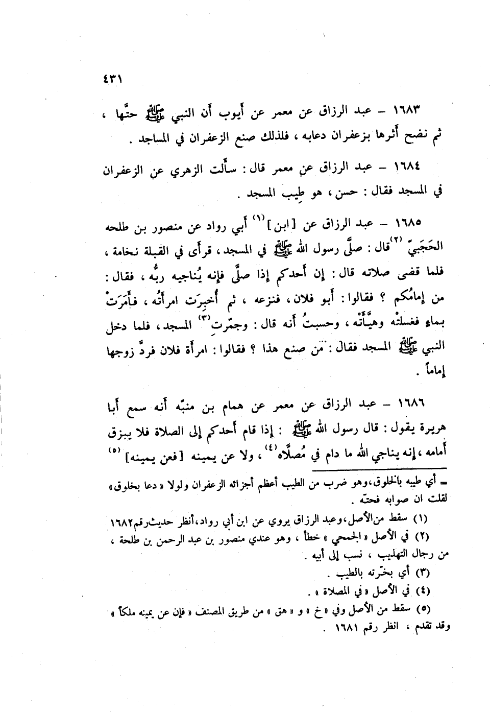 1685 - عَبْدُ الرَّزَّاقِ، عَنِ ابْنِ أَبِي رَوَّادٍ، عَنْ مَنْصُورِ بْنِ طَلْحَةَ الْحَجَبِيِّ قَالَ: صَلَّى رَسُولُ اللَّهِ صَلَّى اللهُ عَلَيْهِ وَسَلَّمَ فِي الْمَسْجِدِ، فَرَأَى فِي الْقِبْلَةِ نُخَامَةً فَلَمَّا قَضَى صَلَاتَهُ قَالَ: «إِنَّ §أَحَدَكُمْ إِذَا صَلَّى فَإِنَّهُ يُنَاجِيهِ رَبُّهُ»، فَقَالَ: «مَنْ إِمَامِكُمْ؟» فَقَالُوا أَبُو فُلَانٍ: فَنَزَعَهُ، ثُمَّ أُخْبِرَتِ امْرَأَتُهُ فَأَمَرَتْ بِمَاءٍ فَغَسَلَتْهُ، وَهَيَّأَتْهُ، وَحَسِبْتُ أَنَّهُ قَالَ: وَجَمَّرَتِ الْمَسْجِدَ، فَلَمَّا دَخَلَ النَّبِيُّ صَلَّى اللهُ عَلَيْهِ وَسَلَّمَ الْمَسْجِدَ، فَقَالَ: «مَنْ صَنَعَ هَذَا؟» فَقَالُوا: امْرَأَةُ فُلَانٍ، فَرَدَّ زَوْجُهَا إِمَامًا