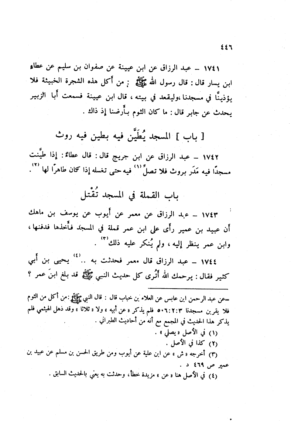 1741 - عَبْدُ الرَّزَّاقِ، عَنِ ابْنِ عُيَيْنَةَ، عَنْ صَفْوَانَ بْنِ سُلَيْمٍ، عَنْ عَطَاءِ بْنِ يَسَارٍ قَالَ: قَالَ رَسُولُ اللَّهِ صَلَّى اللهُ عَلَيْهِ وَسَلَّمَ: «§مَنْ أَكَلَ هَذِهِ الشَّجَرَةَ الْخَبِيثَةَ فَلَا يُؤْذِينَا فِي مَسْجِدِنَا وَلْيَقْعُدْ فِي بَيْتِهِ»