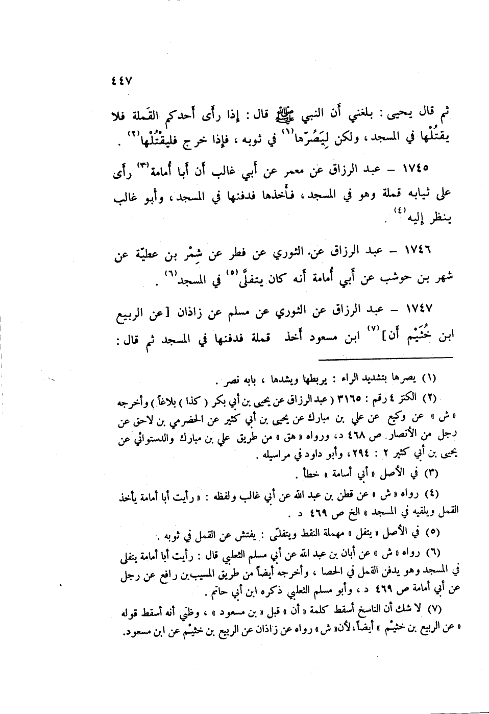 1745 - عَبْدُ الرَّزَّاقِ، عَنْ مَعْمَرٍ، عَنْ أَبِي غَالِبٍ، أَنَّ أَبَا أُمَامَةَ: «§رَأَى عَلَى ثِيَابِهِ قَمْلَةً، وَهُوَ فِي الْمَسْجِدِ فَأَخَذَهَا فَدَفَنَهَا فِي الْمَسْجِدِ». وَأَبُو غَالِبٍ يَنْظُرُ إِلَيْهِ