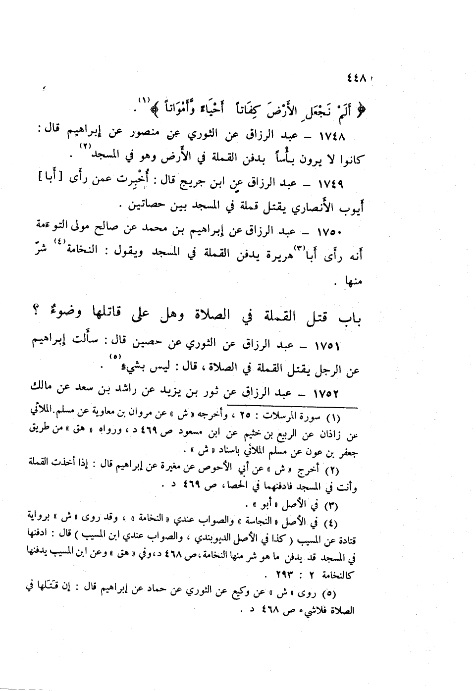 1748 - عَبْدُ الرَّزَّاقِ، عَنِ الثَّوْرِيِّ، عَنْ مَنْصُورٍ، عَنْ إِبْرَاهِيمَ قَالَ: «كَانُوا §لَا يَرَوْنَ بَأْسًا بِدَفْنِ الْقَمْلَةِ فِي الْأَرْضِ وَهُوَ فِي الْمَسْجِدِ»