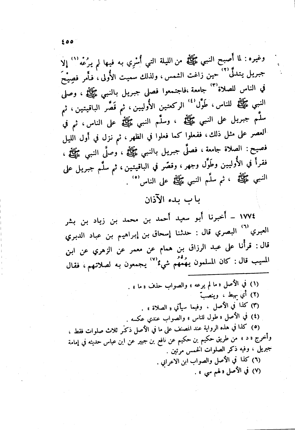 1774 - أَخْبَرَنَا أَبُو سَعِيدٍ أَحْمَدُ بْنُ مُحَمَّدِ بْنِ زِيَادِ بْنِ بِشْرٍ الْعِبْرِيُّ الْبَصْرِيُّ قَالَ: حَدَّثَنَا إِسْحَاقُ بْنُ إِبْرَاهِيمَ بْنِ عَبَّادٍ الدَّبَرِيُّ قَالَ: قَرَأْنَا عَلَى عَبْدِ الرَّزَّاقِ بْنِ هَمَّامٍ، عَنْ مَعْمَرٍ، عَنِ الزُّهْرِيِّ، عَنِ ابْنِ الْمُسَيِّبِ قَالَ: كَانَ الْمُسْلِمُونَ يَهُمُّهُمْ شَيْءٌ يَجْمَعُونَ بِهِ لِصَلَاتِهِمْ، فَقَالَ -[456]-: بَعْضُهُمْ نَاقُوسٌ، وَقَالَ: بَعْضُهُمْ بُوقٌ، فَأُرِيَ عَبْدُ اللَّهِ بْنُ زَيْدٍ الْأَنْصَارِيُّ فِي الْمَنَامِ أَنَّ رَجُلًا مَرَّ بِهِ مَعَهُ نَاقُوسٌ فَقَالَ لَهُ عَبْدُ اللَّهِ: تَبِيعُ هَذَا؟ فَقَالَ الرَّجُلُ: وَمَا تَصْنَعُ بِهِ؟ قَالَ: نَضْرِبُ بِهِ لِصَلَاتِنَا قَالَ: أَفَلَا أَدُلُّكَ عَلَى خَيْرٍ؟ قَالَ: بَلَى قَالَ: تَقُولُ: §اللَّهُ أَكْبَرُ، اللَّهُ أَكْبَرُ، أَشْهَدُ أَنْ لَا إِلَهَ إِلَّا اللَّهُ، أَشْهَدُ أَنْ لَا إِلَهَ إِلَّا اللَّهُ أَشْهَدُ، أَنَّ مُحَمَّدًا رَسُولُ اللَّهِ، أَشْهَدُ أَنَّ مُحَمَّدًا رَسُولُ اللَّهِ، حَيَّ عَلَى الصَّلَاةِ، حَيَّ عَلَى الصَّلَاةِ، حَيَّ عَلَى الْفَلَاحِ، حَيَّ عَلَى الْفَلَاحِ، اللَّهُ أَكْبَرُ، اللَّهُ أَكْبَرُ، لَا إِلَهَ إِلَّا اللَّهُ " قَالَ: وَرَأَى عُمَرُ بْنُ الْخَطَّابِ فِي مَنَامِهِ مِثْلَ ذَلِكَ، فَلَمَّا صَلَّى عَبْدُ اللَّهِ الصُّبْحَ غَدَا إِلَى النَّبِيِّ صَلَّى اللهُ عَلَيْهِ وَسَلَّمَ لِيُخْبِرَهُ، وَغَدَا عُمَرُ فَوَجَدَ الْأَنْصَارِيَّ قَدْ سَبَقَهُ، وَوَجَدَ النَّبِيَّ صَلَّى اللهُ عَلَيْهِ وَسَلَّمَ: «قَدْ أَمَرَ بِلَالًا بِالْأَذَانِ»