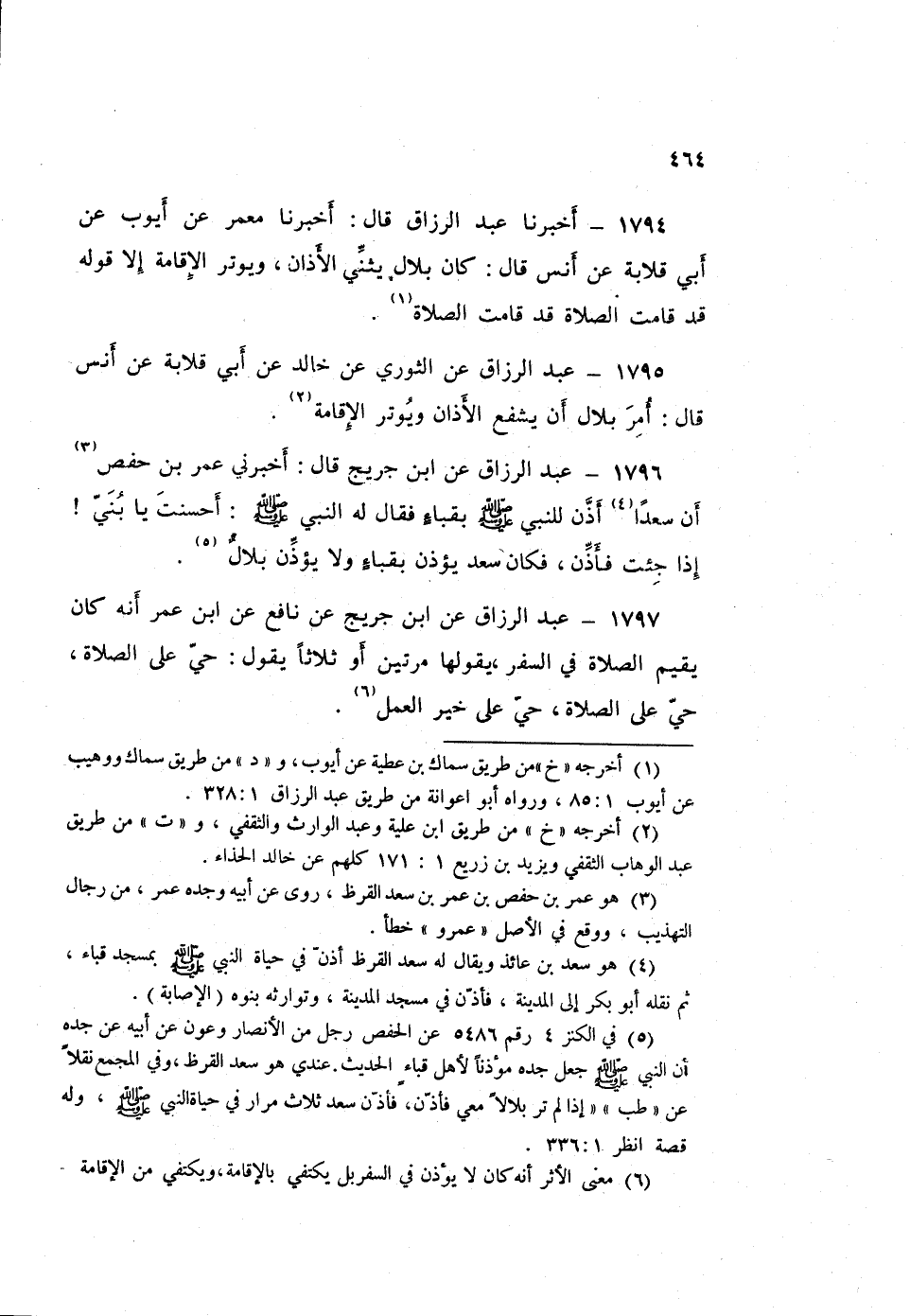 1794 - أَخْبَرَنَا عَبْدُ الرَّزَّاقِ قَالَ: أَخْبَرَنَا مَعْمَرٌ، عَنْ أَيُّوبَ، عَنْ أَبِي قِلَابَةَ، عَنْ أَنَسٍ قَالَ: «كَانَ بِلَالٌ §يُثَنِّي الْأَذَانَ، وَيُوتِرُ الْإِقَامَةَ، إِلَّا قَوْلَهُ قَدْ قَامَتِ الصَّلَاةُ قَدْ قَامَتِ الصَّلَاةُ»