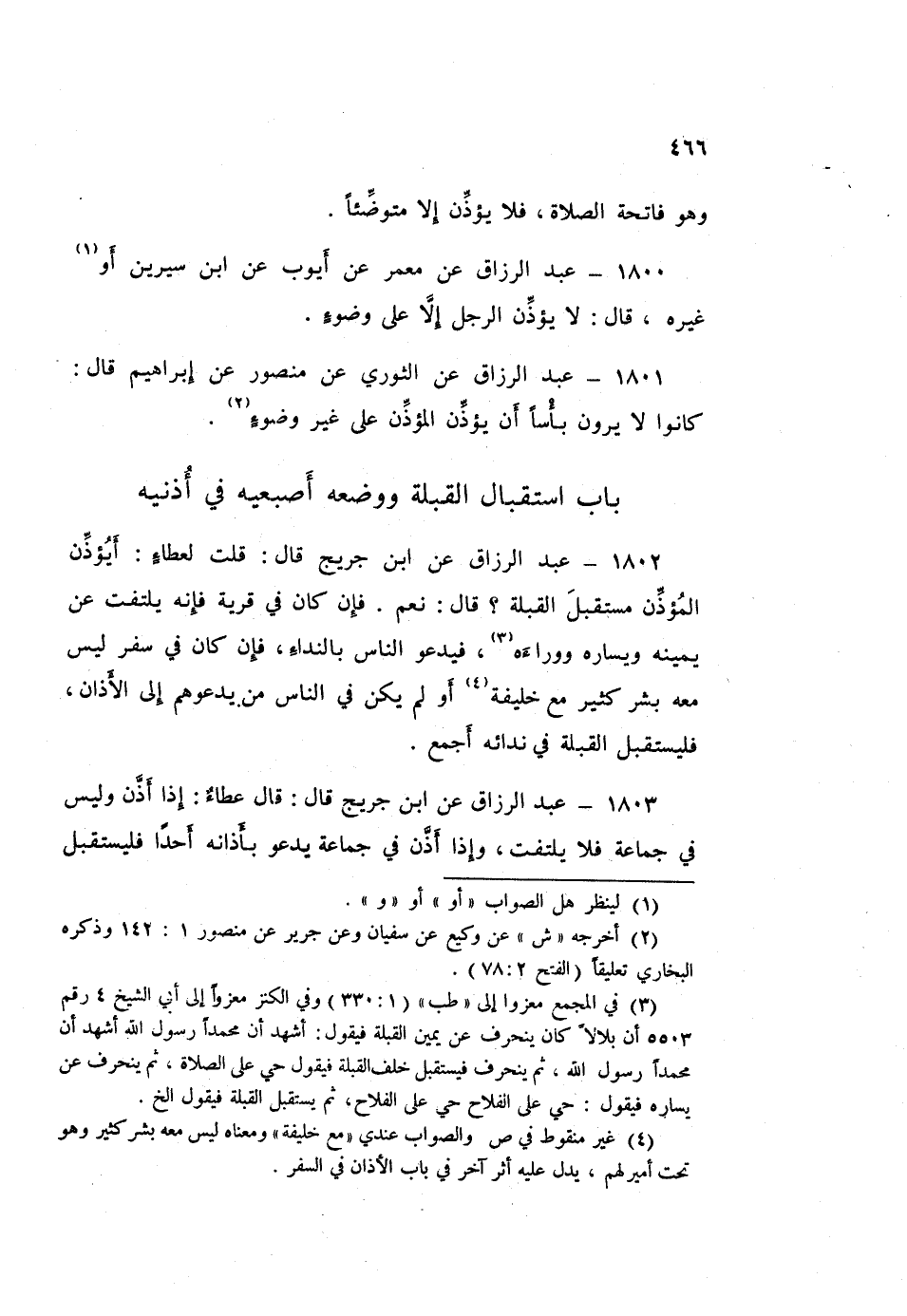 1801 - عَبْدُ الرَّزَّاقِ، عَنِ الثَّوْرِيِّ، عَنْ مَنْصُورٍ، عَنْ إِبْرَاهِيمَ قَالَ: «كَانُوا §لَا يَرَوْنَ بَأْسًا أَنْ يُؤَذِّنَ الْمُؤَذِّنُ عَلَى غَيْرِ وُضُوءٍ»