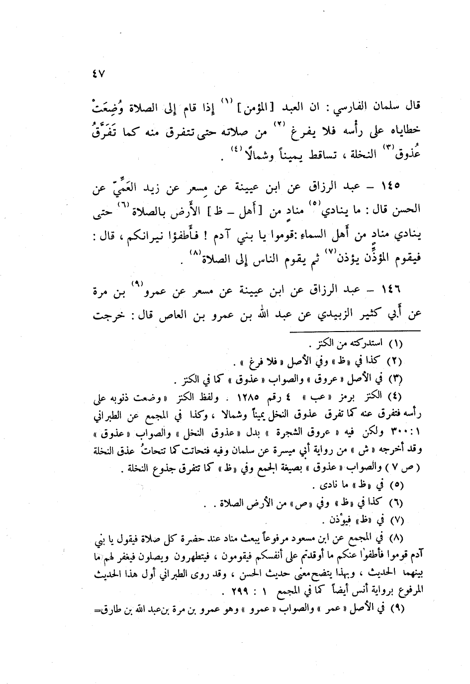 146 - عَبْدُ الرَّزَّاقِ، عَنِ ابْنِ عُيَيْنَةَ، عَنْ مِسْعَرٍ، عَنْ عَمْرِو بْنِ مُرَّةَ، عَنْ أَبِي كَثِيرٍ الزُّبَيْدِيِّ، عَنْ عَبْدِ اللَّهِ بْنِ عَمْرِو بْنِ الْعَاصِ قَالَ: «§خَرَجَتْ فِي عُنُقِ آدَمَ شَأْفَةٌ - يَعْنِي بَثْرَةً - فَصَلَّى صَلَاةً فَانْحَدَرَتْ إِلَى صَدْرِهِ، ثُمَّ صَلَّى صَلَاةً فَانْحَدَرَتْ إِلَى الْحَقْوِ، ثُمَّ صَلَّى صَلَاةً فَانْحَدَرَتْ إِلَى الْكَفِّ، ثُمَّ صَلَّى صَلَاةً فَانْحَدَرَتْ إِلَى الْإِبْهَامِ، ثُمَّ صَلَّى صَلَاةً فَذَهَبَتْ»