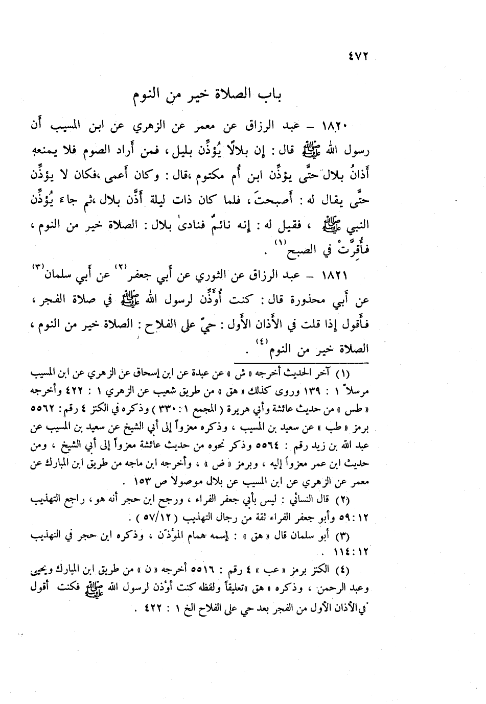 1820 - عَبْدُ الرَّزَّاقِ، عَنْ مَعْمَرٍ، عَنِ الزُّهْرِيِّ، عَنِ ابْنِ الْمُسَيِّبِ، أَنَّ رَسُولَ اللَّهِ صَلَّى اللهُ عَلَيْهِ وَسَلَّمَ قَالَ: «إِنَّ §بِلَالًا يُؤَذِّنُ بِلَيْلٍ فَمَنْ أَرَادَ الصَّوْمَ، فَلَا يَمْنَعُهُ أَذَانُ بِلَالٍ حَتَّى يُؤَذِّنَ ابْنُ أُمِّ مَكْتُومٍ» قَالَ: وَكَانَ أَعْمَى فَكَانَ لَا يُؤَذِّنُ حَتَّى يُقَالَ لَهُ: أَصْبَحْتَ، فَلَمَّا كَانَ ذَاتَ لَيْلَةٍ أَذَّنَ بِلَالٌ، ثُمَّ جَاءَ يُؤَذِّنُ النَّبِيَّ صَلَّى اللهُ عَلَيْهِ وَسَلَّمَ فَقِيلَ لَهُ: إِنَّهُ نَائِمٌ، فَنَادَى بِلَالٌ: الصَّلَاةُ خَيْرٌ مِنَ النَّوْمِ، فَأُقِرَّتْ فِي الصُّبْحِ