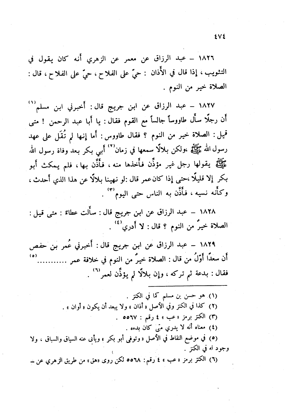 1826 - عَبْدُ الرَّزَّاقِ، عَنْ مَعْمَرٍ، عَنِ الزُّهْرِيِّ، أَنَّهُ كَانَ يَقُولُ فِي التَّثْوِيبِ: " §إِذَا قَالَ فِي الْأَذَانِ: حَيَّ عَلَى الْفَلَاحِ، حَيَّ عَلَى الْفَلَاحِ قَالَ: الصَّلَاةُ خَيْرٌ مِنَ النَّوْمِ "