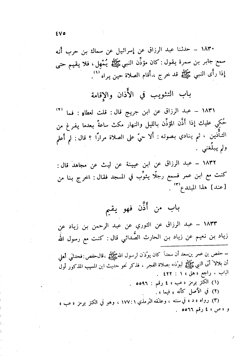 1833 - عَبْدُ الرَّزَّاقِ، عَنِ الثَّوْرِيِّ، عَنْ عَبْدِ الرَّحْمَنِ بْنِ زِيَادٍ، عَنْ زِيَادِ بْنِ نُعَيْمٍ، عَنْ زِيَادِ بْنِ الْحَارِثِ الصُّدَائِيِّ قَالَ: كُنْتُ مَعَ رَسُولِ اللَّهِ فَأَمَرَنِي، فَأَذَّنْتُ الْفَجْرَ فَجَاءَ بِلَالٌ، فَقَالَ النَّبِيُّ صَلَّى اللهُ عَلَيْهِ وَسَلَّمَ: «يَا بِلَالُ، إِنَّ أَخَا صُدَاءَ قَدْ أَذَّنَ، §وَمَنْ أَذَّنَ فَهُوَ يُقِيمُ»