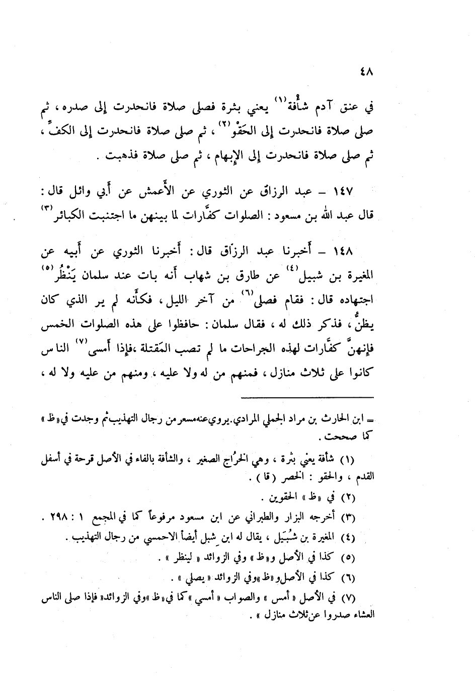 147 - عَبْدُ الرَّزَّاقِ، عَنِ الثَّوْرِيِّ، عَنِ الْأَعْمَشِ، عَنْ أَبِي وَائِلٍ قَالَ: قَالَ عَبْدُ اللَّهِ بْنُ مَسْعُودٍ: «§الصَّلَوَاتُ كَفَّارَاتٌ لِمَا بَيْنَهُنَّ مَا اجْتُنِبَتِ الْكَبَائِرُ»