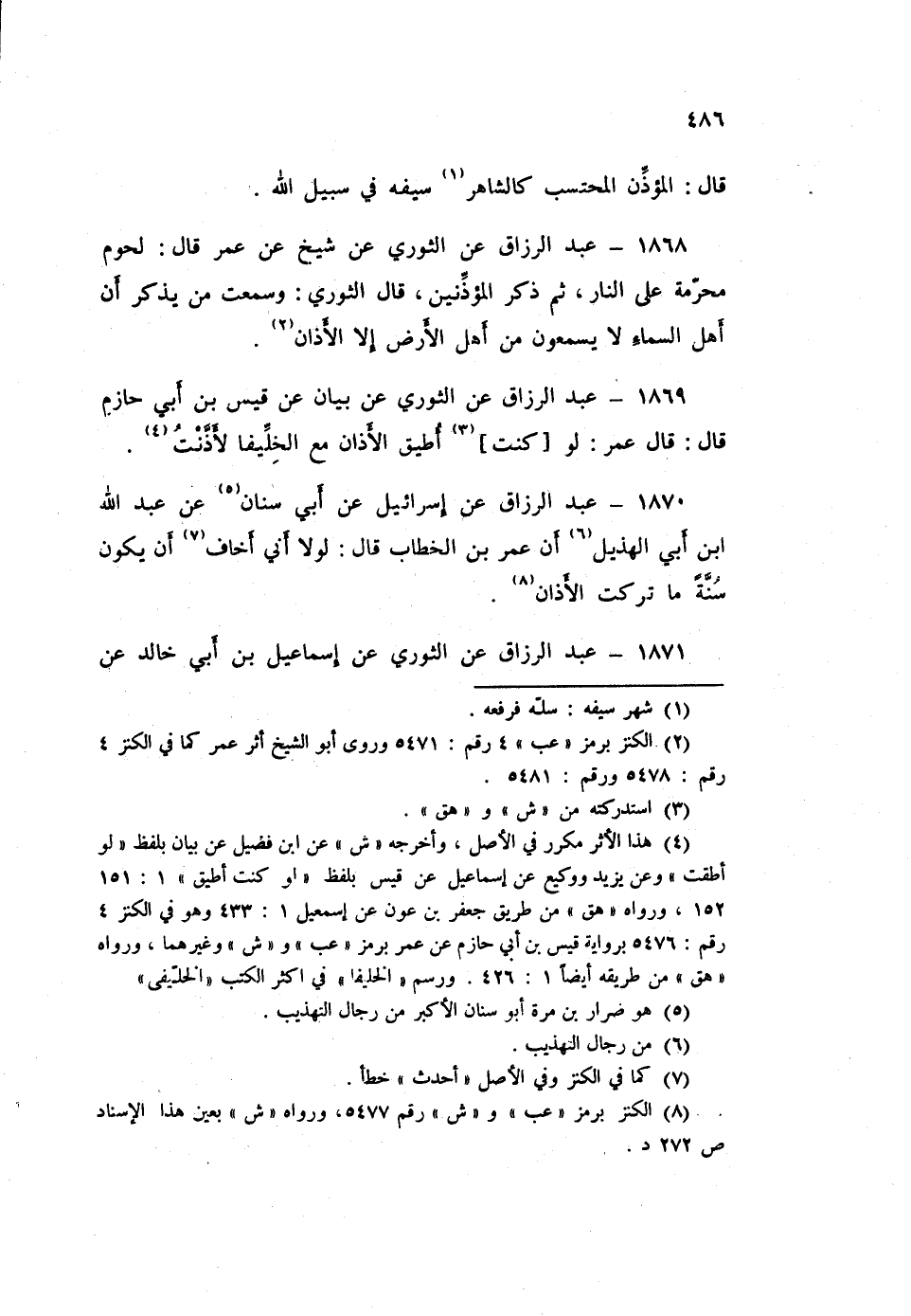1870 - عَبْدُ الرَّزَّاقِ، عَنْ إِسْرَائِيلَ، عَنْ أَبِي سِنَانٍ، عَنْ عَبْدِ اللَّهِ بْنِ أَبِي الْهُذَيْلِ، أَنَّ عُمَرَ بْنَ الْخَطَّابِ قَالَ: «§لَوْلَا أَنِّي أَخَافُ أَنْ يَكُونَ سُنَّةً مَا تَرَكْتُ الْأَذَانَ»
