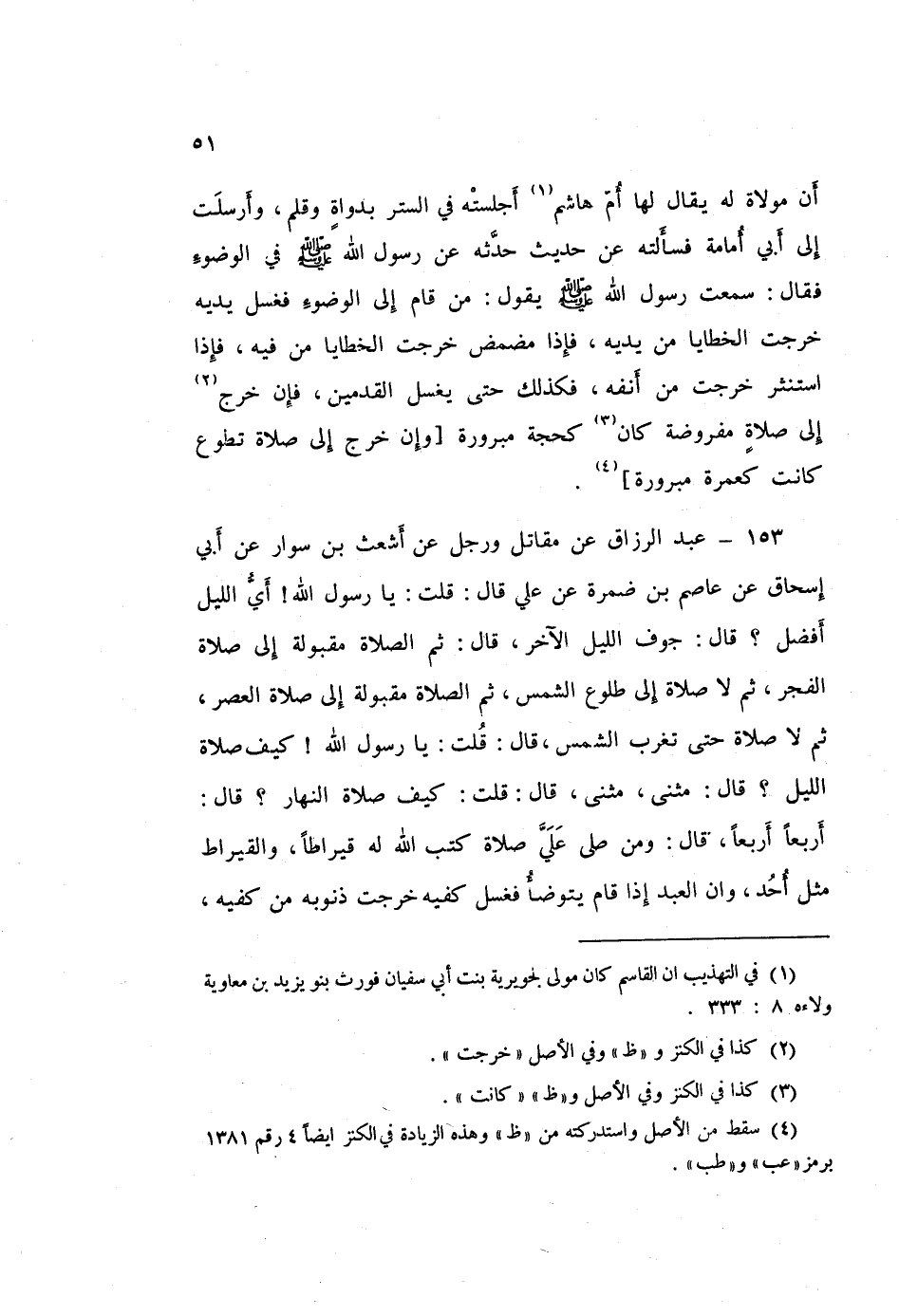 153 - عَبْدُ الرَّزَّاقِ، عَنْ مُقَاتِلٍ، وَرَجُلٌ، عَنْ أَشْعَثَ بْنِ سَوَّارٍ، عَنْ أَبِي إِسْحَاقَ، عَنْ عَاصِمِ بْنِ ضَمْرَةَ، عَنْ عَلِيٍّ قَالَ: قُلْتُ: يَا رَسُولَ اللَّهِ، أيُّ اللَّيْلِ أَفْضَلُ؟ قَالَ: «جَوْفُ اللَّيْلِ الْآخِرُ» قَالَ: «ثُمَّ الصَّلَاةُ مَقْبُولَةٌ إِلَى صَلَاةِ الْفَجْرِ، ثُمَّ لَا صَلَاةَ إِلَى طُلُوعِ الشَّمْسِ، ثُمَّ الصَّلَاةُ مَقْبُولَةٌ إِلَى صَلَاةِ الْعَصْرِ، ثُمَّ لَا صَلَاةَ حَتَّى تَغْرُبَ الشَّمْسُ» قَالَ: قُلْتُ: يَا رَسُولَ اللَّهِ، كَيْفَ صَلَاةُ اللَّيْلِ؟ قَالَ: «مَثْنَى مَثْنَى» قَالَ: قُلْتُ: كَيْفَ صَلَاةُ النَّهَارِ؟ قَالَ: «أَرْبَعًا أَرْبَعًا» قَالَ: «§وَمَنْ صَلَّى عَلَيَّ صَلَاةً كَتَبَ اللَّهُ لَهُ قِيرَاطًا، وَالْقِيرَاطُ مِثْلُ أُحُدٍ، وَأَنَّ الْعَبْدَ إِذَا قَامَ يَتَوَضَّأُ فَغَسَلَ كَفَّيْهِ خَرَجَتْ ذُنُوبُهُ مِنْ كَفَّيْهِ -[52]-، ثُمَّ إِذَا مَضْمَضَ وَاسْتَنْشَقَ خَرَجَتْ ذُنُوبُهُ مِنْ خَيَاشِيمِهِ، ثُمَّ إِذَا غَسَلَ وَجْهَهُ خَرَجَتْ ذُنُوبُهُ مِنْ وَجْهِهِ وَسَمْعِهِ وَبَصَرِهِ، ثُمَّ إِذَا غَسَلَ ذِرَاعَيْهِ خَرَجَتْ ذُنُوبُهُ مِنْ ذِرَاعَيْهِ، ثُمَّ إِذَا مَسَحَ بِرَأْسِهِ خَرَجَتْ ذُنُوبُهُ مِنْ رَأْسِهِ، ثُمَّ إِذَا غَسَلَ رِجْلَيْهِ خَرَجَتْ ذُنُوبُهُ مِنْ رِجْلَيْهِ، ثُمَّ إِذَا قَامَ إِلَى الصَّلَاةِ خَرَجَ مِنْ ذُنُوبِهِ كَيَوْمِ وَلَدَتْهُ أُمُّهُ»