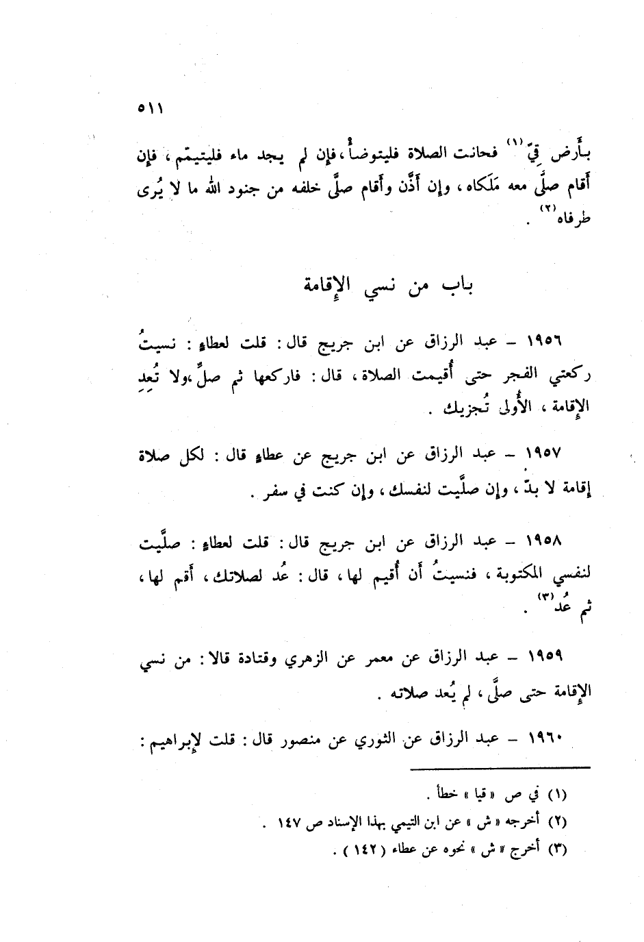 1959 - عَبْدُ الرَّزَّاقِ، عَنْ مَعْمَرٍ، عَنِ الزُّهْرِيِّ، وَقَتَادَةَ، قَالَا: «§مَنْ نَسِيَ الْإِقَامَةَ حَتَّى صَلَّى لَمْ يُعِدْ صَلَاتَهُ»