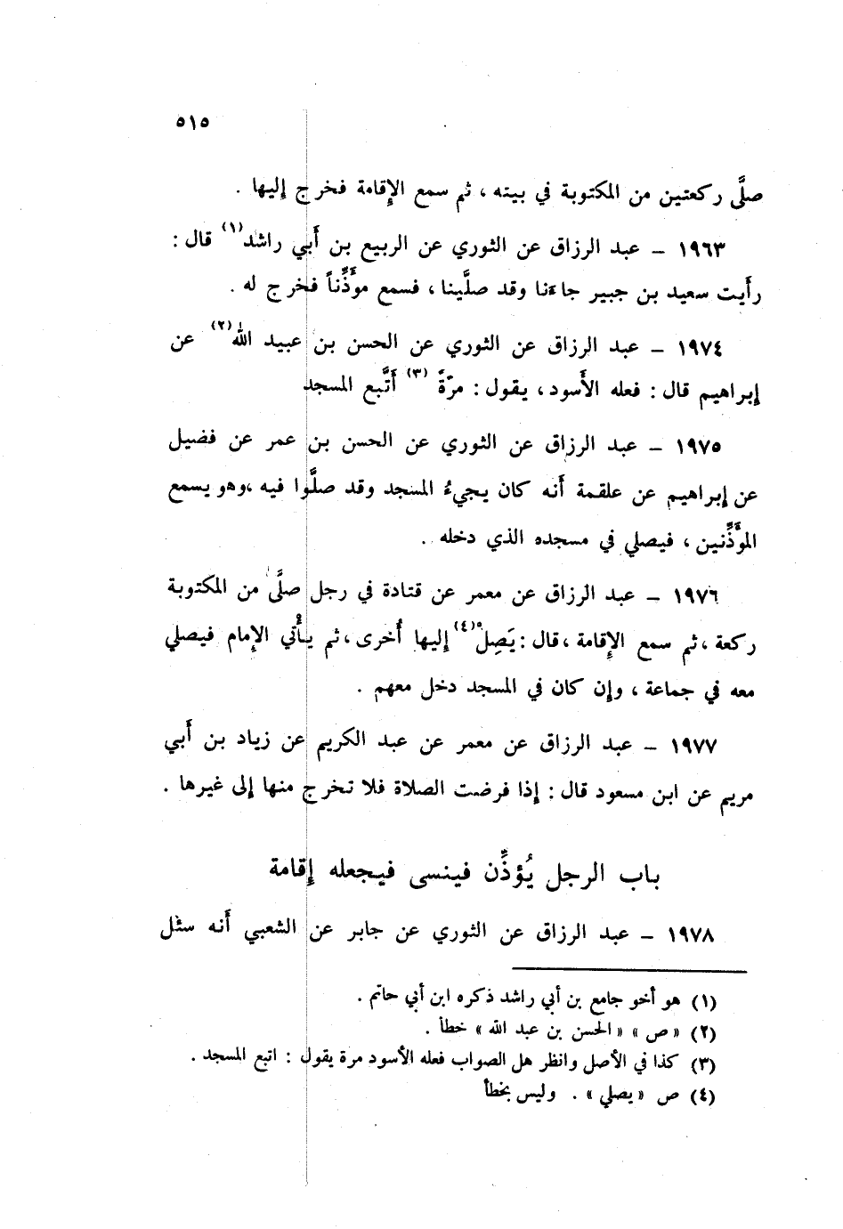1975 - عَبْدُ الرَّزَّاقِ، عَنِ الثَّوْرِيِّ، عَنِ الْحَسَنِ بْنِ عُمَرَ، عَنْ فُضَيْلٍ، عَنْ إِبْرَاهِيمَ، عَنْ عَلْقَمَةَ، أَنَّهُ كَانَ «§يَجِيءُ الْمَسْجِدَ، وَقَدْ صَلَّوْا فِيهِ، وَهُوَ يَسْمَعُ الْمُؤَذِّنِينَ فَيُصَلِّي فِي مَسْجِدِهِ الَّذِي دَخَلَهُ»