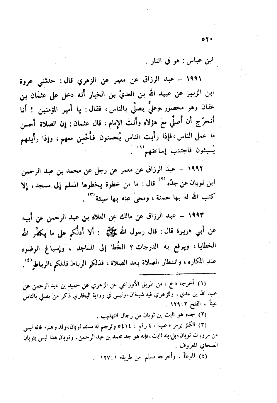 1993 - عَبْدُ الرَّزَّاقِ، عَنْ مَالِكٍ، عَنِ الْعَلَاءِ بْنِ عَبْدِ الرَّحْمَنِ، عَنْ أَبِيهِ، عَنْ أَبِي هُرَيْرَةَ قَالَ: قَالَ رَسُولُ اللَّهِ صَلَّى اللهُ عَلَيْهِ وَسَلَّمَ: «أَلَا أَدُلُّكُمْ عَلَى مَا يُكَفِّرُ اللَّهُ الْخَطَايَا، وَيَرْفَعُ بِهِ الدَّرَجَاتِ؟ §الْخُطَا إِلَى الْمَسَاجِدِ، وَإِسْبَاغُ الْوُضُوءِ عِنْدَ الْمَكَارِهِ، وَانْتِظَارُ الصَّلَاةِ بَعْدَ الصَّلَاةِ، فَذَلِكُمُ الرِّبَاطُ فَذَلِكُمُ الرِّبَاطُ»