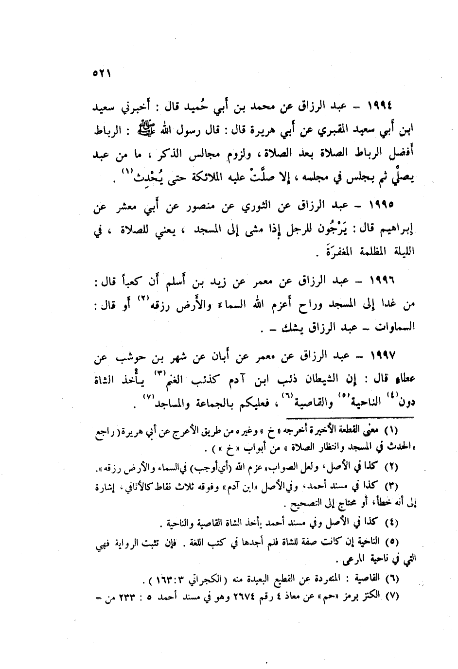 1995 - عَبْدُ الرَّزَّاقِ، عَنِ الثَّوْرِيِّ، عَنْ مَنْصُورٍ، عَنْ أَبِي مَعْشَرٍ، عَنْ إِبْرَاهِيمَ قَالَ: «§يَرْجُونَ لِلرَّجُلِ إِذَا مَشَى إِلَى الْمَسْجِدِ - يَعْنِي لِلصَّلَاةِ فِي اللَّيْلَةِ الْمُظْلِمَةِ - الْمَغْفِرَةَ»