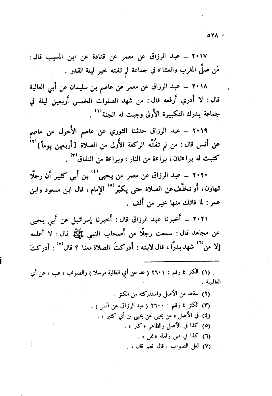 2017 - عَبْدُ الرَّزَّاقِ، عَنْ مَعْمَرٍ، عَنْ قَتَادَةَ، عَنِ ابْنِ الْمُسَيِّبِ قَالَ: «§مَنْ صَلَّى الْمَغْرِبَ وَالْعِشَاءَ فِي جَمَاعَةٍ، لَمْ يَفُتْهُ خَيْرُ لَيْلَةِ الْقَدْرِ»