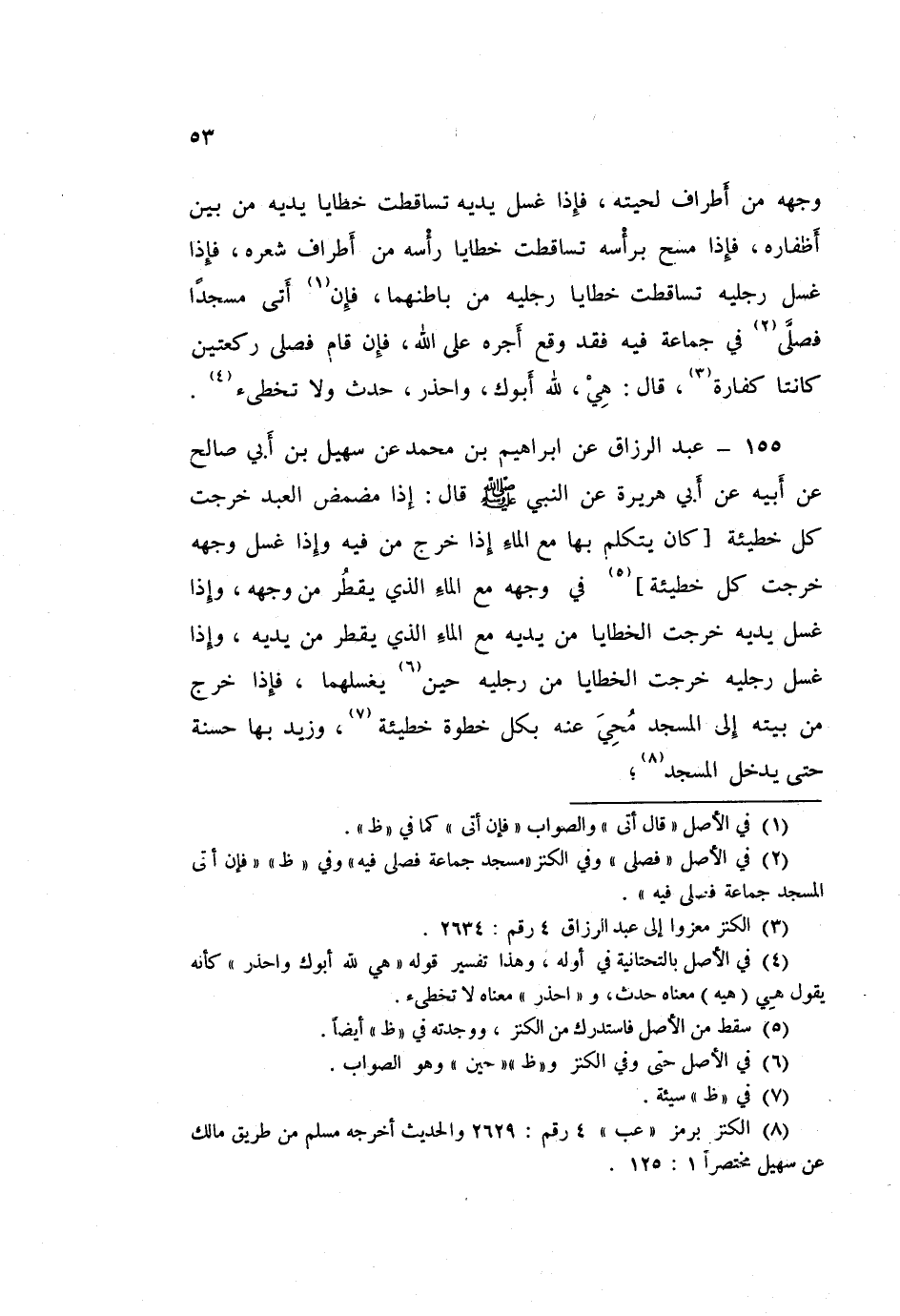 155 - عَبْدُ الرَّزَّاقِ، عَنْ إِبْرَاهِيمَ بْنِ مُحَمَّدٍ، عَنْ سُهَيْلِ بْنِ أَبِي صَالِحٍ، عَنْ أَبِيهِ، عَنْ أَبِي هُرَيْرَةَ، عَنِ النَّبِيِّ صَلَّى اللهُ عَلَيْهِ وَسَلَّمَ قَالَ: «§إِذَا مَضْمَضَ الْعَبْدُ خَرَجَتْ كُلُّ خَطِيئَةٍ كَانَ يَتَكَلَّمُ بِهَا مَعَ الْمَاءِ إِذَا خَرَجَ مِنْ فِيهِ، وَإِذَا غَسَلَ وَجْهَهُ خَرَجَتْ كُلُّ خَطِيئَةٍ فِي وَجْهِهِ مَعَ الْمَاءِ الَّذِي يَقْطُرُ مِنْ وَجْهِهِ، وَإِذَا غَسَلَ يَدَيْهِ، خَرَجَتِ الْخَطَايَا مِنْ يَدَيْهِ مَعَ الْمَاءِ الَّذِي يَقْطُرُ مِنْ يَدَيْهِ، وَإِذَا غَسَلَ رِجْلَيْهِ خَرَجَتِ الْخَطَايَا مِنْ رِجْلَيْهِ حِينَ يَغْسِلُهُمَا، فَإِذَا خَرَجَ مِنْ بَيْتِهِ إِلَى الْمَسْجِدِ مُحِيَ عَنْهُ بِكُلِّ خُطْوَةٍ خَطِيئَةٌ، وَزِيدَ بِهَا حَسَنَةً حَتَّى يَدْخُلَ الْمَسْجِدَ»