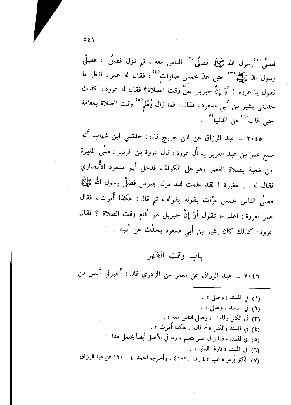 2045 - عَبْدُ الرَّزَّاقِ، عَنِ ابْنِ جُرَيْجٍ قَالَ: حَدَّثَنِي ابْنُ شِهَابٍ، أَنَّهُ سَمِعَ عُمَرَ بْنَ عَبْدِ الْعَزِيزِ، يَسْأَلُ عُرْوَةَ، قَالَ عُرْوَةُ بْنُ الزُّبَيْرِ: مَسَّى الْمُغِيرَةُ بْنُ شُعْبَةَ بِصَلَاةِ الْعَصْرِ وَهُوَ عَلَى الْكُوفَةِ، فَدَخَلَ أَبُو مَسْعُودٍ الْأَنْصَارِيُّ، فَقَالَ لَهُ: «يَا مُغِيرَةُ لَقَدْ عَلِمْتُ لَقَدْ §نَزَلَ جِبْرِيلُ فَصَلَّى رَسُولُ اللَّهِ صَلَّى اللهُ عَلَيْهِ وَسَلَّمَ، فَصَلَّى النَّاسُ خَمْسَ مَرَّاتٍ بِقَوْلِهِ» يَقُولُهُ ثُمَّ قَالَ: «هَكَذَا أُمِرْتُ». فَقَالَ عُمَرُ لِعُرْوَةَ: اعْلَمْ مَا تَقُولُ أَوَ إِنَّ جِبْرِيلَ هُوَ أَقَامَ وَقْتَ الصَّلَاةِ " فَقَالَ عُرْوَةُ: كَذَلِكَ كَانَ بَشِيرُ بْنُ أَبِي مَسْعُودٍ يُحَدِّثُ، عَنْ أَبِيهِ