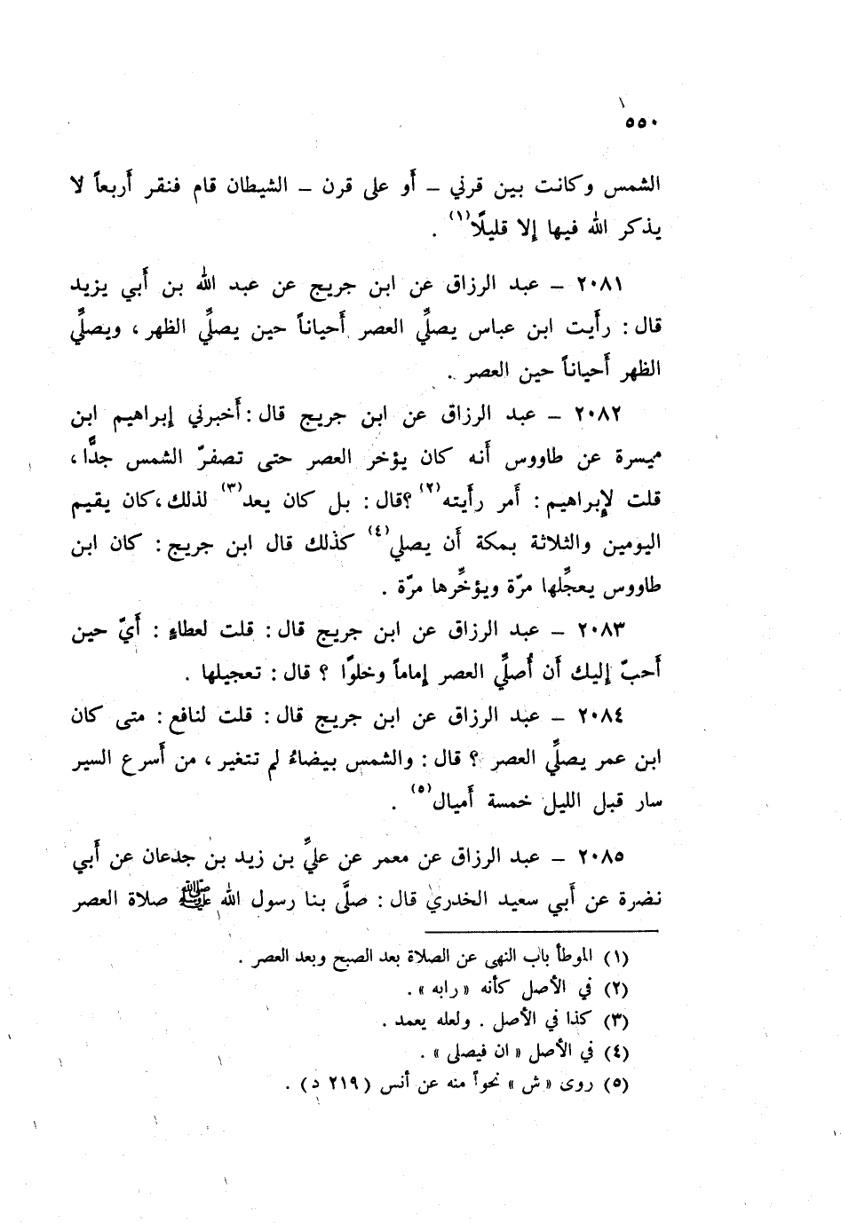 2082 - عَبْدُ الرَّزَّاقِ، عَنِ ابْنِ جُرَيْجٍ قَالَ: أَخْبَرَنِي إِبْرَاهِيمُ بْنُ مَيْسَرَةَ، عَنْ طَاوُسٍ أَنَّهُ كَانَ «§يُؤَخِّرُ الْعَصْرَ حَتَّى تَصْفَرَّ الشَّمْسُ جِدًّا» قُلْتُ لِإِبْرَاهِيمَ: أَمْرٌ رَأَيْتُهُ؟ قَالَ: «بَلْ كَانَ يَعُدُّ لِذَلِكَ، كَانَ يُقِيمُ الْيَوْمَيْنِ وَالثَّلَاثَةَ بِمَكَّةَ أَنْ يُصَلِّيَ». كَذَلِكَ قَالَ ابْنُ جُرَيْجٍ: كَانَ ابْنُ طَاوُسٍ «يُعَجِّلُهَا مَرَّةً وَيُؤَخِّرُهَا مَرَّةً»