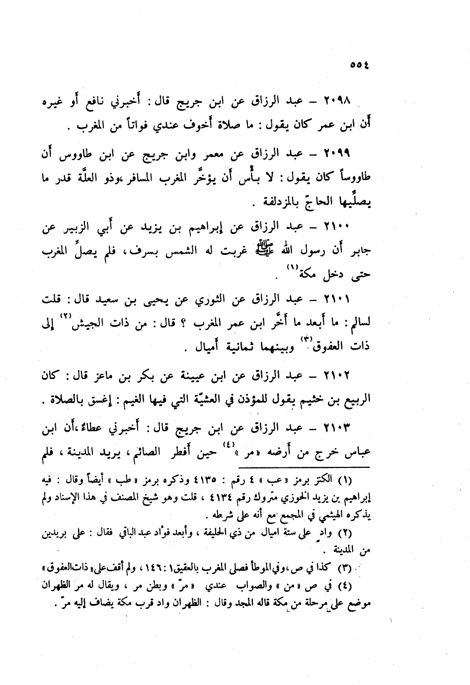 2100 - عَبْدُ الرَّزَّاقِ، عَنْ إِبْرَاهِيمَ بْنِ يَزِيدَ، عَنْ أَبِي الزُّبَيْرِ، عَنْ جَابِرٍ: أَنَّ رَسُولَ اللَّهِ صَلَّى اللهُ عَلَيْهِ وَسَلَّمَ: «§غَرَبَتْ لَهُ الشَّمْسُ بِسَرِفَ، فَلَمْ يُصَلِّ الْمَغْرِبَ حَتَّى دَخَلَ مَكَّةَ»