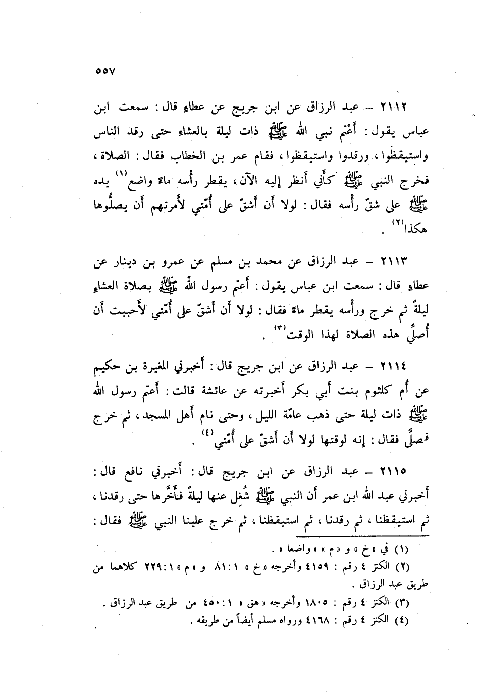 2112 - عَبْدُ الرَّزَّاقِ، عَنِ ابْنِ جُرَيْجٍ، عَنْ عَطَاءٍ قَالَ: سَمِعْتُ ابْنَ عَبَّاسٍ يَقُولُ: أَعْتَمَ نَبِيُّ اللَّهِ صَلَّى اللهُ عَلَيْهِ وَسَلَّمَ ذَاتَ لَيْلَةٍ بِالْعِشَاءِ، حَتَّى رَقَدَ النَّاسُ، وَاسْتَيْقَظُوا، وَرَقَدُوا، وَاسْتَيْقَظُوا، فَقَامَ عُمَرُ بْنُ الْخَطَّابِ فَقَالَ: الصَّلَاةُ، فَخَرَجَ النَّبِيُّ صَلَّى اللهُ عَلَيْهِ وَسَلَّمَ كَأَنِّي أَنْظُرُ إِلَيْهِ الْآنَ يَقْطُرُ رَأْسُهُ مَاءً وَاضِعٌ يَدَهُ صَلَّى اللَّهُ عَلَيْهِ وَسَلَّمَ عَلَى شِقِّ رَأْسِهِ فَقَالَ: «§لَوْلَا أَنْ أَشُقَّ عَلَى أُمَّتِي لَأَمَرْتُهُمْ أَنْ يُصَلُّوهَا هَكَذَا»