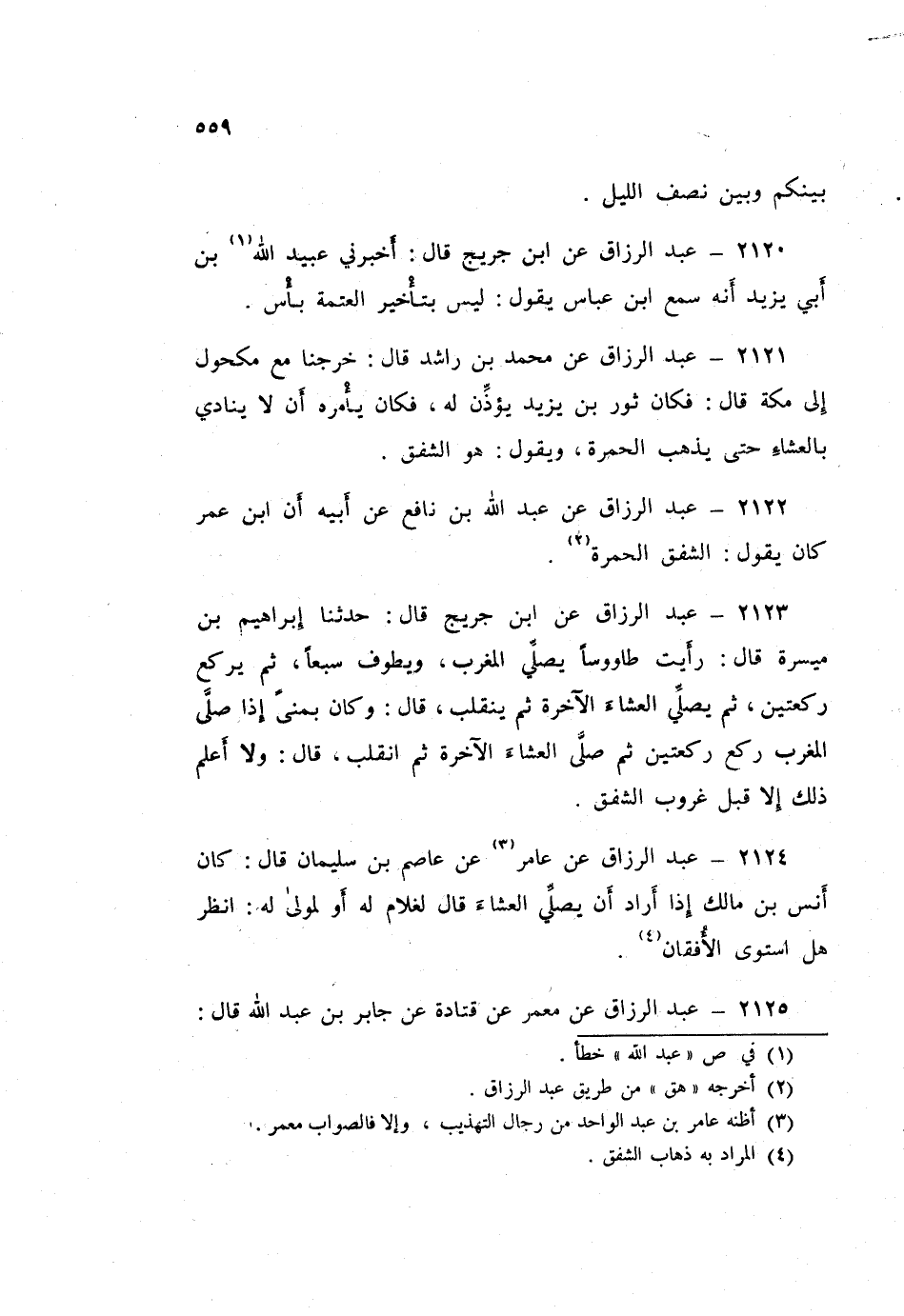 2124 - عَبْدُ الرَّزَّاقِ، عَنْ عَامِرٍ، عَنْ عَاصِمِ بْنِ سُلَيْمَانَ قَالَ: كَانَ أَنَسُ بْنُ مَالِكٍ، §إِذَا أَرَادَ أَنْ يُصَلِّيَ الْعِشَاءَ قَالَ لِغُلَامٍ لَهُ - أَوْ لِمَوْلًى لَهُ -: «انْظُرْ هَلِ اسْتَوَى الْأُفُقَانِ؟»