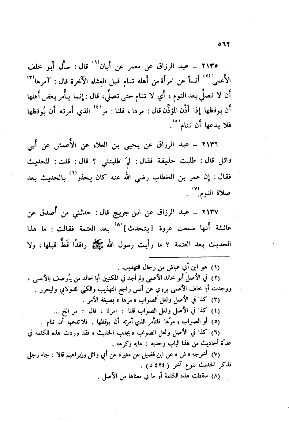 2136 - عَبْدُ الرَّزَّاقِ، عَنْ يَحْيَى بْنِ الْعَلَاءِ، عَنِ الْأَعْمَشِ، عَنْ أَبِي وَائِلٍ قَالَ: طَلَبْتُ حُذَيْفَةَ، فَقَالَ: لِمَ طَلَبْتَنِي؟ قَالَ: قُلْتُ: لِلْحَدِيثِ، فَقَالَ: إِنَّ عُمَرَ بْنَ الْخَطَّابِ رَضِيَ اللَّهُ عَنْهُ، كَانَ «§يُحَذِّرُ بِالْحَدِيثِ بَعْدَ صَلَاةِ النَّوْمِ»