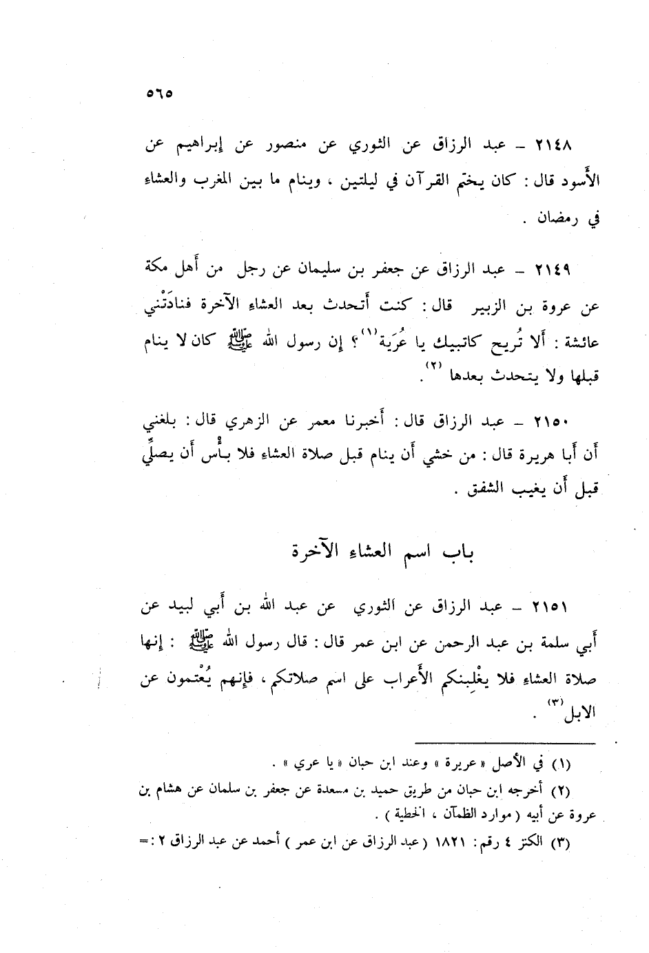 2149 - عَبْدُ الرَّزَّاقِ، عَنْ جَعْفَرِ بْنِ سُلَيْمَانَ، عَنْ رَجُلٍ، مِنْ أَهْلِ مَكَّةَ، عَنْ عُرْوَةَ بْنِ الزُّبَيْرِ قَالَ: كُنْتُ أَتَحَدَّثُ بَعْدَ الْعِشَاءِ الْآخِرَةِ فَنَادَتْنِي عَائِشَةُ: أَلَا تُرِيحُ كَاتِبَيْكَ يَا عُرَيَّةُ؟ إِنَّ رَسُولَ اللَّهِ صَلَّى اللهُ عَلَيْهِ وَسَلَّمَ كَانَ «§لَا يَنَامُ قَبْلَهَا، وَلَا يَتَحَدَّثُ بَعْدَهَا»