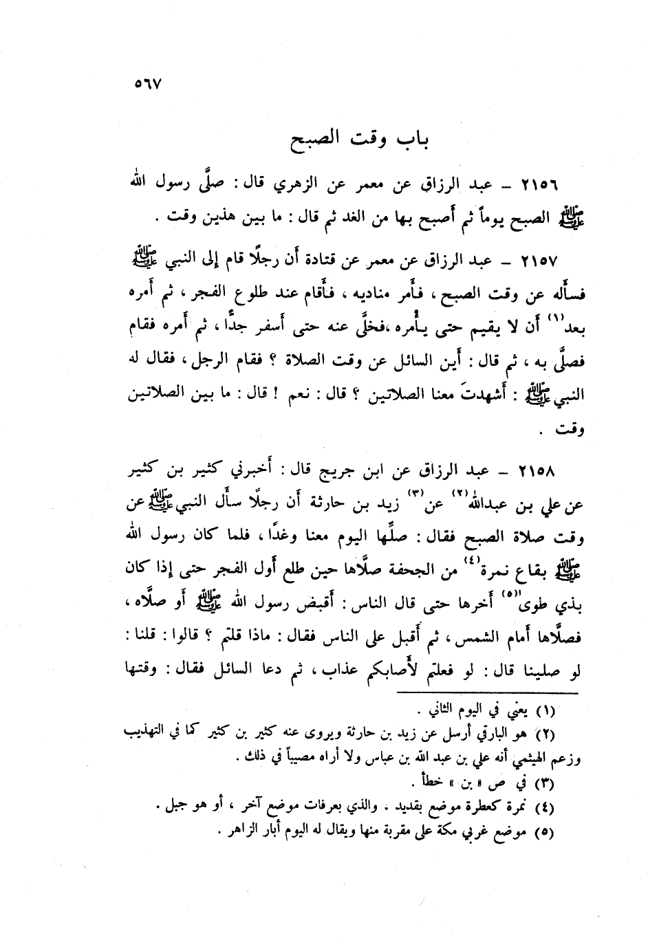 2158 - عَبْدُ الرَّزَّاقِ، عَنِ ابْنِ جُرَيْجٍ قَالَ: أَخْبَرَنِي كَثِيرُ بْنُ كَثِيرٍ، عَنْ عَلِيِّ بْنِ عَبْدِ اللَّهِ، عَنْ زَيْدِ بْنِ حَارِثَةَ، أَنَّ رَجُلًا سَأَلَ النَّبِيَّ صَلَّى اللهُ عَلَيْهِ وَسَلَّمَ عَنْ وَقْتِ صَلَاةِ الصُّبْحِ، فَقَالَ: «صَلِّهَا الْيَوْمَ مَعَنَا وَغَدًا» فَلَمَّا كَانَ رَسُولُ اللَّهِ صَلَّى اللهُ عَلَيْهِ وَسَلَّمَ بِقَاعِ نَمِرَةَ مِنَ الْجُحْفَةِ صَلَّاهَا حِينَ طَلَعَ أَوَّلُ الْفَجْرِ، حَتَّى إِذَا كَانَ بِذِي طُوًى أَخَّرَهَا، حَتَّى قَالَ النَّاسُ: أَقُبِضَ رَسُولُ اللَّهِ صَلَّى اللهُ عَلَيْهِ وَسَلَّمَ أَوْ صَلَّاهُ، فَصَلَّاهَا أَمَامَ الشَّمْسِ، ثُمَّ أَقْبَلَ عَلَى النَّاسِ فَقَالَ: «مَاذَا قُلْتُمْ؟» قَالُوا: قُلْنَا: لَوْ صَلَّيْنَا. قَالَ: «§لَوْ فَعَلْتُمْ لَأَصَابَكُمْ عَذَابٌ» ثُمَّ دَعَا السَّائِلَ فَقَالَ: «وَقْتُهَا -[568]- مَا بَيْنَ صَلَاتَيَّ»