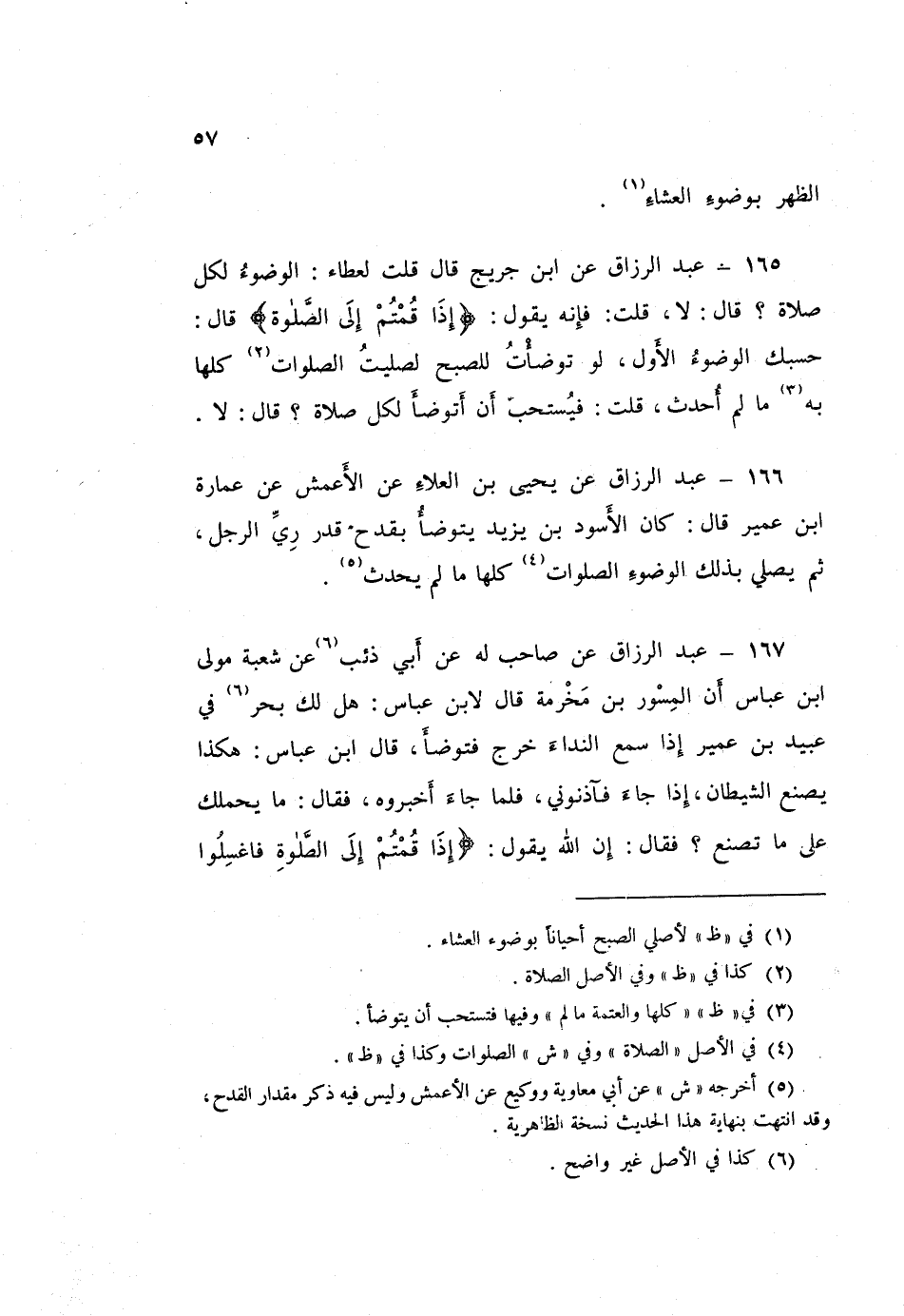 165 - عَبْدُ الرَّزَّاقِ، عَنِ ابْنِ جُرَيْجٍ قَالَ: قُلْتُ لِعَطَاءٍ: الْوُضُوءُ لِكُلِّ صَلَاةٍ؟ قَالَ: «لَا»، قُلْتُ: فَإِنَّهُ يَقُولُ: {إِذَا قُمْتُمْ إِلَى الصَّلَاةِ} [المائدة: 6] قَالَ: «حَسْبُكَ الْوُضُوءُ الْأَوَّلُ، §لَوْ تَوَضَّأْتُ لِلصُّبْحِ لَصَلَّيْتُ الصَّلَوَاتِ كُلَّهَا بِهِ مَا لَمْ أُحْدِثْ» قُلْتُ: فَيُسْتَحَبُّ أَنْ أَتَوَضَّأَ لِكُلِّ صَلَاةٍ؟ قَالَ: «لَا»