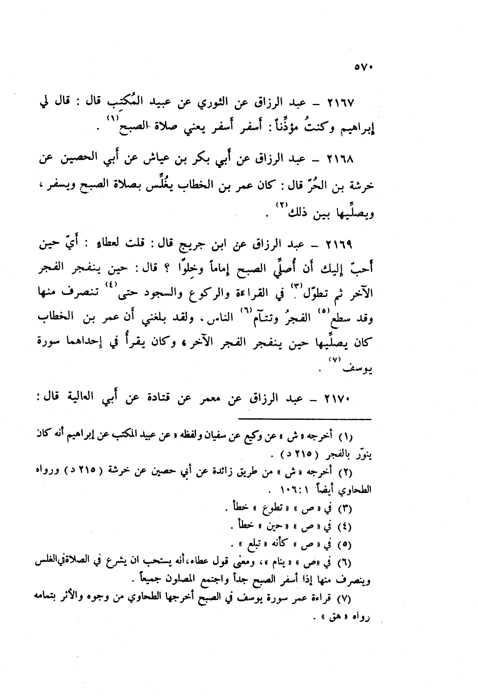 2168 - عَبْدُ الرَّزَّاقِ، عَنْ أَبِي بَكْرِ بْنِ عَيَّاشٍ، عَنْ أَبِي الْحُصَيْنِ، عَنْ خَرَشَةَ بْنِ الْحُرِّ قَالَ: كَانَ عُمَرُ بْنُ الْخَطَّابِ، «§يُغَلِّسُ بِصَلَاةِ الصُّبْحِ، وَيُسْفِرُ، وَيُصَلِّيهَا بَيْنَ ذَلِكَ»