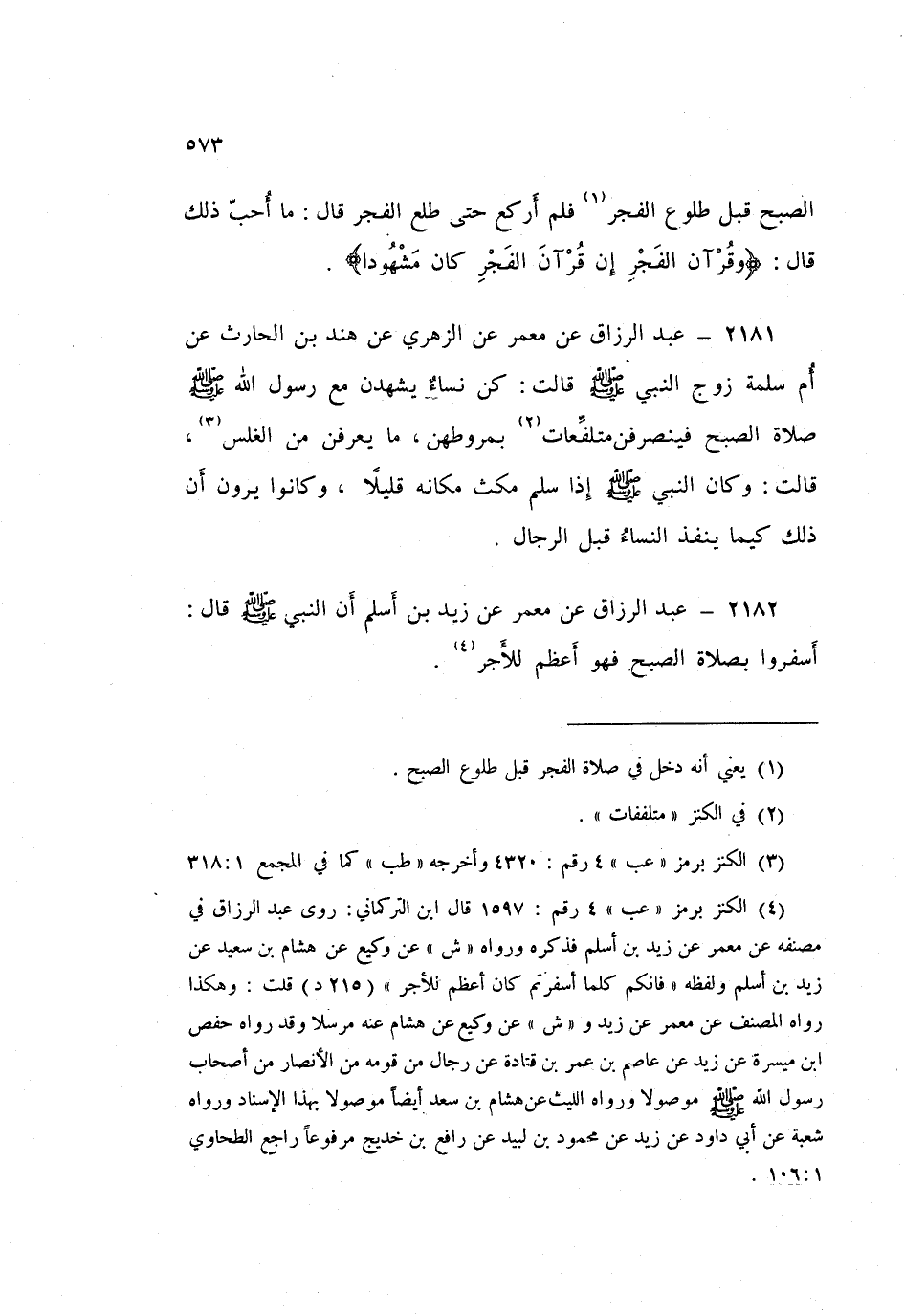 2182 - عَبْدُ الرَّزَّاقِ، عَنْ مَعْمَرٍ، عَنْ زَيْدِ بْنِ أَسْلَمَ، أَنَّ النَّبِيَّ صَلَّى اللهُ عَلَيْهِ وَسَلَّمَ قَالَ: «§أَسْفِرُوا بِصَلَاةِ الصُّبْحِ، فَهُوَ أَعْظَمُ لِلْأَجْرِ»