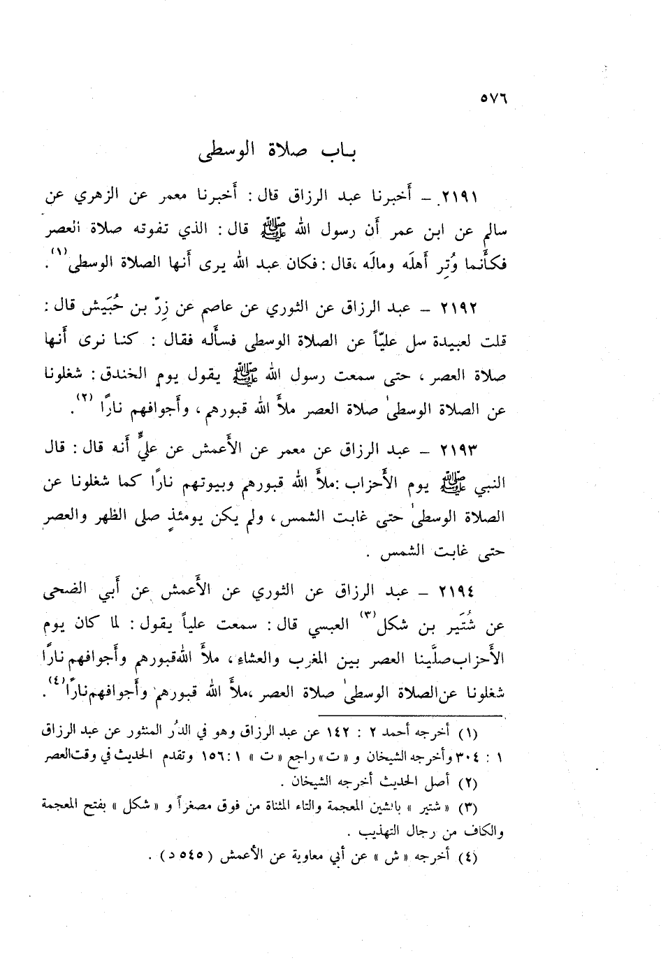 2194 - عَبْدُ الرَّزَّاقِ، عَنِ الثَّوْرِيِّ، عَنِ الْأَعْمَشِ، عَنْ أَبِي الضُّحَى، عَنْ شُتَيْرِ بْنِ شَكَلٍ الْعَبْسِيِّ قَالَ: سَمِعْتُ عَلِيًّا يَقُولُ: «لَمَّا كَانَ يَوْمُ الْأَحْزَابِ صَلَّيْنَا الْعَصْرَ، بَيْنَ الْمَغْرِبِ وَالْعِشَاءِ، §مَلَأَ اللَّهُ قُبُورَهُمْ وَأَجْوَافَهُمْ نَارًا، شَغَلُونَا عَنِ الصَّلَاةِ الْوُسْطَى، صَلَاةِ الْعَصْرِ، مَلَأَ اللَّهُ قُبُورَهُمْ وَأَجْوَافَهُمْ نَارًا»