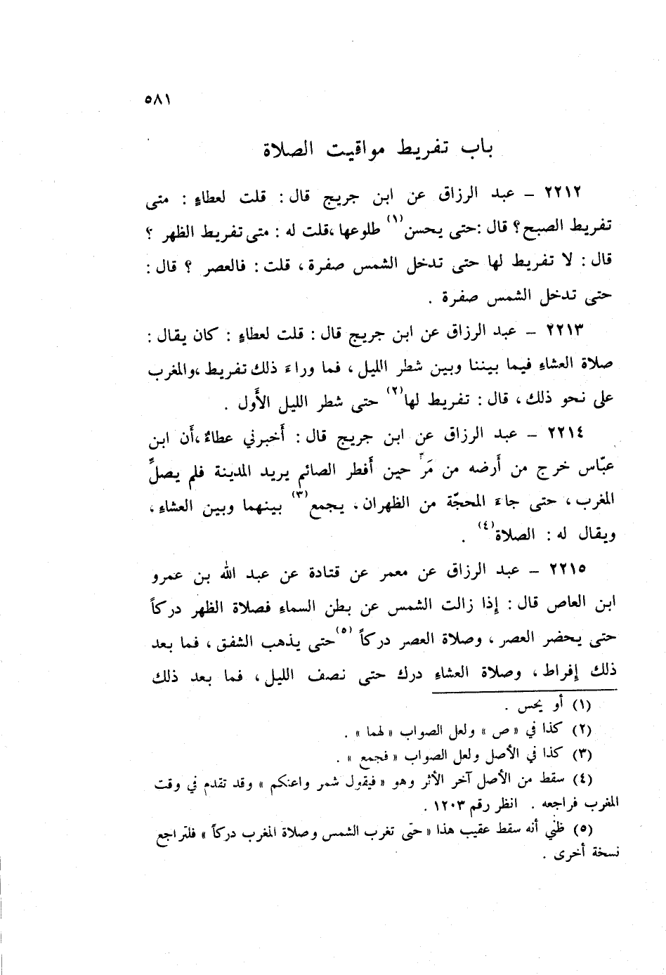 2213 - عَبْدُ الرَّزَّاقِ، عَنِ ابْنِ جُرَيْجٍ قَالَ: قُلْتُ لِعَطَاءٍ: كَانَ يُقَالُ: §صَلَاةُ الْعِشَاءِ فِيمَا بَيْنَنَا وَبَيْنَ شَطْرِ اللَّيْلِ، فَمَا وَرَاءَ ذَلِكَ تَفْرِيطٌ، وَالْمَغْرِبُ عَلَى نَحْوِ ذَلِكَ قَالَ: «تَفْرِيطٌ لَهَا حَتَّى شَطْرِ اللَّيْلِ الْأَوَّلِ»