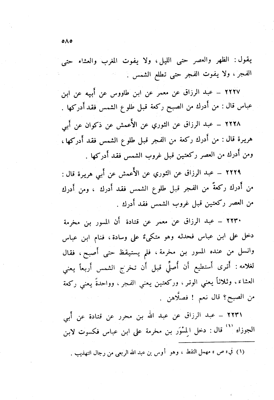 2230 - عَبْدُ الرَّزَّاقِ، عَنْ مَعْمَرٍ، عَنْ قَتَادَةَ، أَنَّ الْمِسْوَرَ بْنَ مَخْرَمَةَ، دَخَلَ عَلَى ابْنِ عَبَّاسٍ فَحَدَّثَهُ وَهُوَ مُتَّكِئٌ عَلَى وِسَادَةٍ، فَنَامَ ابْنُ عَبَّاسٍ، وَانْسَلَّ مِنْ عِنْدِهِ الْمِسْوَرُ بْنُ مَخْرَمَةَ، فَلَمْ يَسْتَيْقِظْ، حَتَّى أَصْبَحَ، فَقَالَ لِغُلَامِهِ: «§أَتُرَى أَسْتَطِيعُ أَنْ أُصَلِّيَ قَبْلَ أَنْ تَخْرُجَ الشَّمْسُ أَرْبَعًا، - يَعْنِي الْعِشَاءَ - وَثَلَاثًا - يَعْنِي الْوِتْرَ - وَرَكْعَتَيْنِ - يَعْنِي الْفَجْرَ - وَوَاحِدَةً - يَعْنِي رَكْعَةً مِنَ الصُّبْحِ؟ -» قَالَ: نَعَمْ، فَصَلَّاهُنَّ