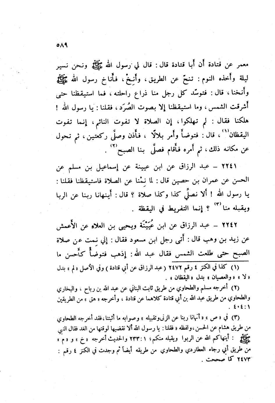 2242 - عَبْدُ الرَّزَّاقِ، عَنِ ابْنِ عُيَيْنَةَ، وَيَحْيَى بْنِ الْعَلَاءِ، عَنِ الْأَعْمَشِ، عَنْ زَيْدِ بْنِ وَهْبٍ قَالَ: أَتَى رَجُلٌ ابْنَ مَسْعُودٍ، فَقَالَ: إِنِّي نِمْتُ عَنْ صَلَاةِ الصُّبْحِ، حَتَّى طَلَعَتِ الشَّمْسُ فَقَالَ عَبْدُ اللَّهِ: «§اذْهَبْ فَتَوَضَّأْ، كَأَحْسَنِ مَا كَنْتَ مُتَوَضِّئًا، وَصَلِّ كَأَحْسَنِ مَا كُنْتَ مُصَلِّيًا»، ثُمَّ أَعَادَ عَلَيْهِ الْقَوْلَ فَقَالَ لَهُ مِثْلَ ذَلِكَ: فَلَمْ تَدَعْهُ نَفْسُهُ مِنْ عِظَمِ خَطِيئَتِهِ فِي نَفْسِهِ حَتَّى أَعْبُدَ اللَّهَ حِينَ خَفَّ مِنْ عِنْدِهِ، فَقَالَ: يَا أَبَا عَبْدِ الرَّحْمَنِ فَأَعَادَ عَلَيْهِ الْقَوْلَ قَالَ: فَأَخَذَ عَبْدُ اللَّهِ بِيَدِهِ وَقَالَ: «إِنَّمَا يُقَالُ لَكَ لِتَفْعَلَ، اذْهَبْ فَتَوَضَّأْ كَأَحْسَنِ مَا كُنْتَ مُتَوَضِّئًا، وَصَلِّ كَأَحْسَنِ مَا كُنْتَ مُصَلِّيًا»