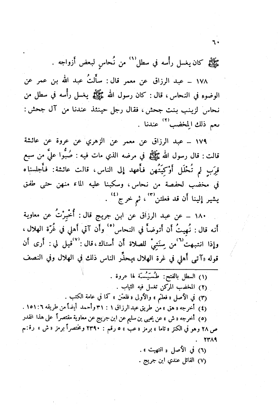 178 - عَبْدُ الرَّزَّاقِ، عَنْ مَعْمَرٍ قَالَ: سَأَلْتُ عَبْدَ اللَّهِ بْنَ عُمَرَ، عَنِ الْوُضُوءِ فِي النُّحَاسِ قَالَ: كَانَ رَسُولُ اللَّهِ صَلَّى اللهُ عَلَيْهِ وَسَلَّمَ، «§يَغْسِلُ رَأْسَهُ فِي سَطْلٍ مِنْ نُحَاسٍ لِزَيْنَبَ بِنْتِ جَحْشٍ». فَقَالَ رَجُلٌ حِينَئِذٍ عِنْدَنَا مِنْ آلِ جَحْشٍ: نَعَمْ ذَلِكَ الْمِخْضَبُ عِنْدَنَا