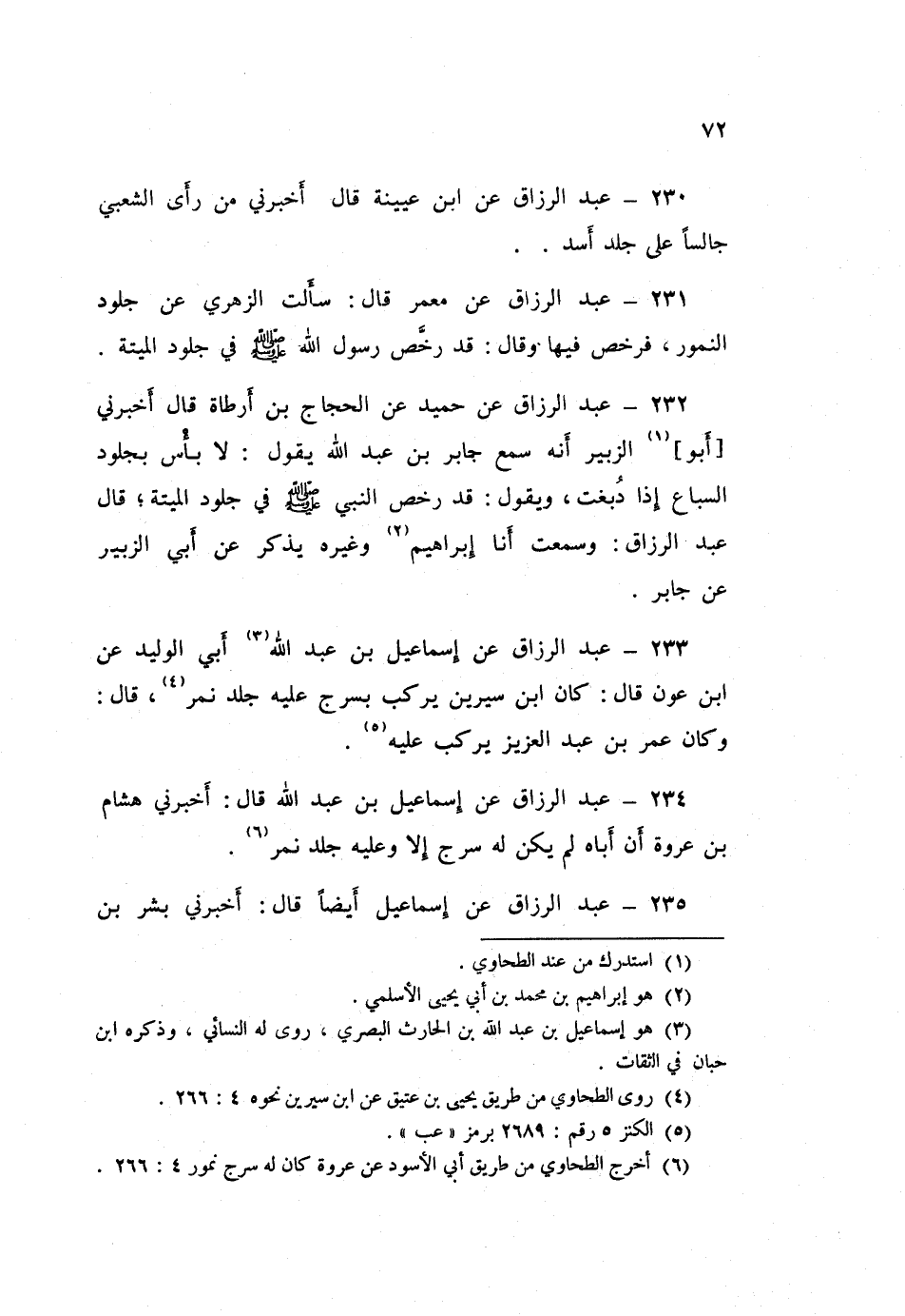 231 - عَبْدُ الرَّزَّاقِ، عَنْ مَعْمَرٍ قَالَ: سَأَلْتُ الزُّهْرِيَّ عَنْ جُلُودِ النُّمُورِ، فَرَخَّصَ فِيهَا، وَقَالَ: «§قَدْ رَخَّصَ رَسُولُ اللَّهِ صَلَّى اللهُ عَلَيْهِ وَسَلَّمَ فِي جُلُودِ الْمَيْتَةِ»