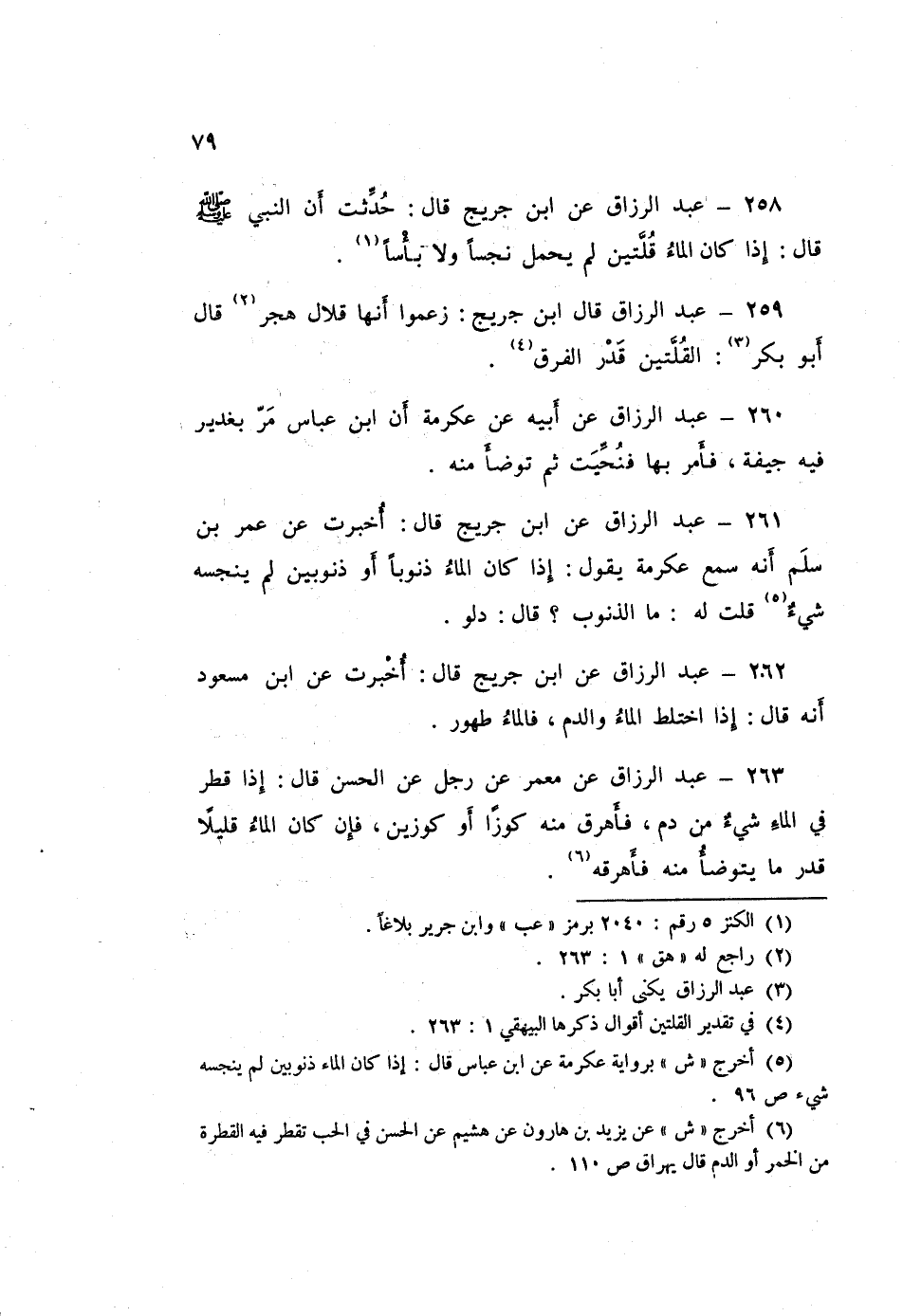 258 - عَبْدُ الرَّزَّاقِ، عَنِ ابْنِ جُرَيْجٍ قَالَ: حُدِّثْتُ أَنَّ النَّبِيَّ صَلَّى اللهُ عَلَيْهِ وَسَلَّمَ قَالَ: «§إِذَا كَانَ الْمَاءُ قُلَّتَيْنِ لَمْ يَحْمِلْ نَجِسًا وَلَا بَأْسًا»