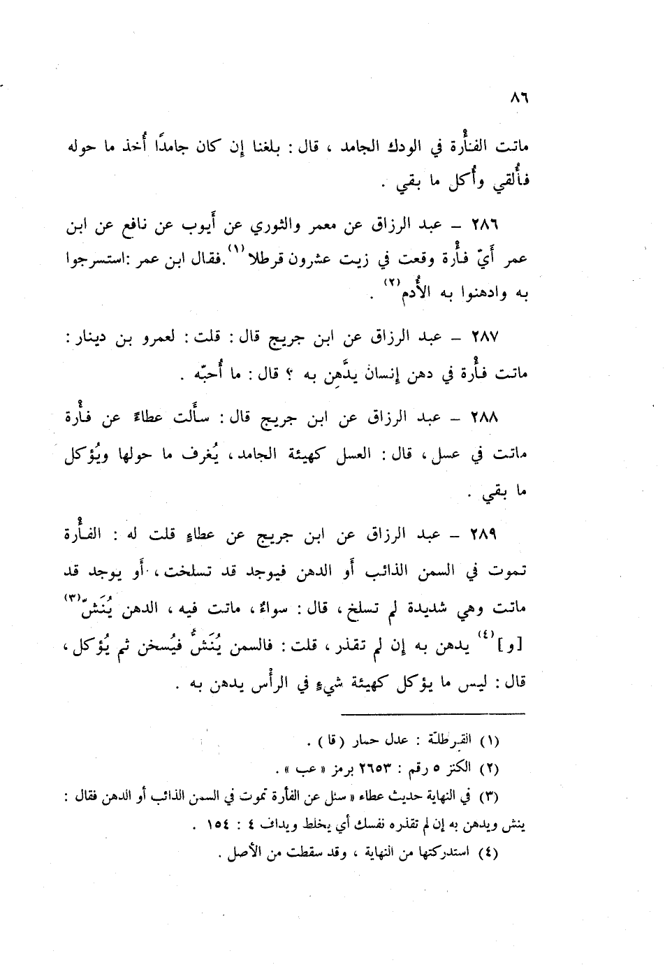 286 - عَبْدُ الرَّزَّاقِ، عَنْ مَعْمَرٍ، وَالثَّوْرِيُّ، عَنْ أَيُّوبَ، عَنْ نَافِعٍ، عَنِ ابْنِ عُمَرَ، أَيُّ فَأْرَةٍ وَقَعَتْ فِي زَيْتٍ عِشْرُونَ قَرْطَلًا، فَقَالَ ابْنُ عُمَرَ: «§اسْتَسْرِجُوا بِهِ وَادَّهِنُوا بِهِ الْأُدْمَ»
