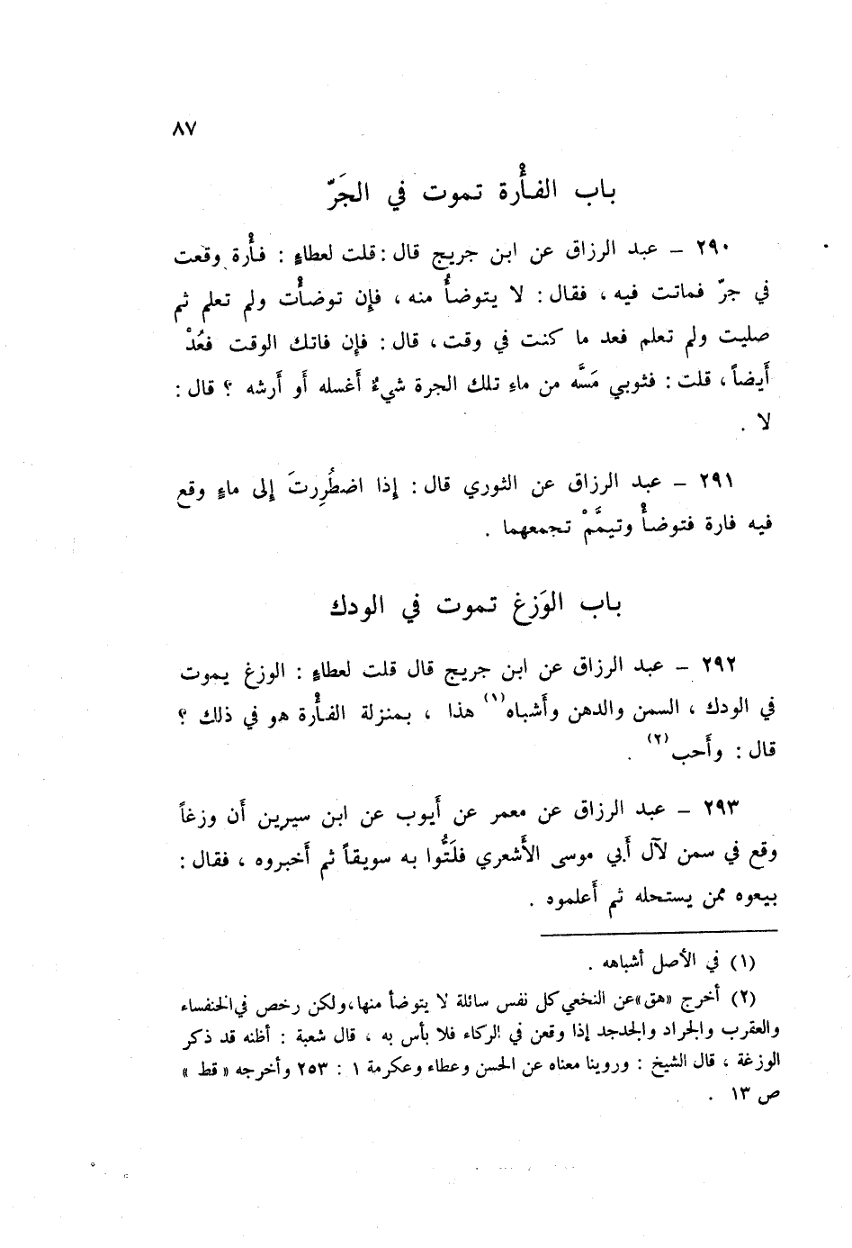 292 - عَبْدُ الرَّزَّاقِ، عَنِ ابْنِ جُرَيْجٍ قَالَ: قُلْتُ لِعَطَاءٍ: الْوَزَغُ يَمُوتُ فِي الْوَدَكِ السَّمْنِ وَالدُّهْنِ، وَأَشْبَاهِ هَذَا بِمَنْزِلَةِ الْفَأْرَةِ هُوَ فِي ذَلِكَ قَالَ: «§وَأُحِبُّ»