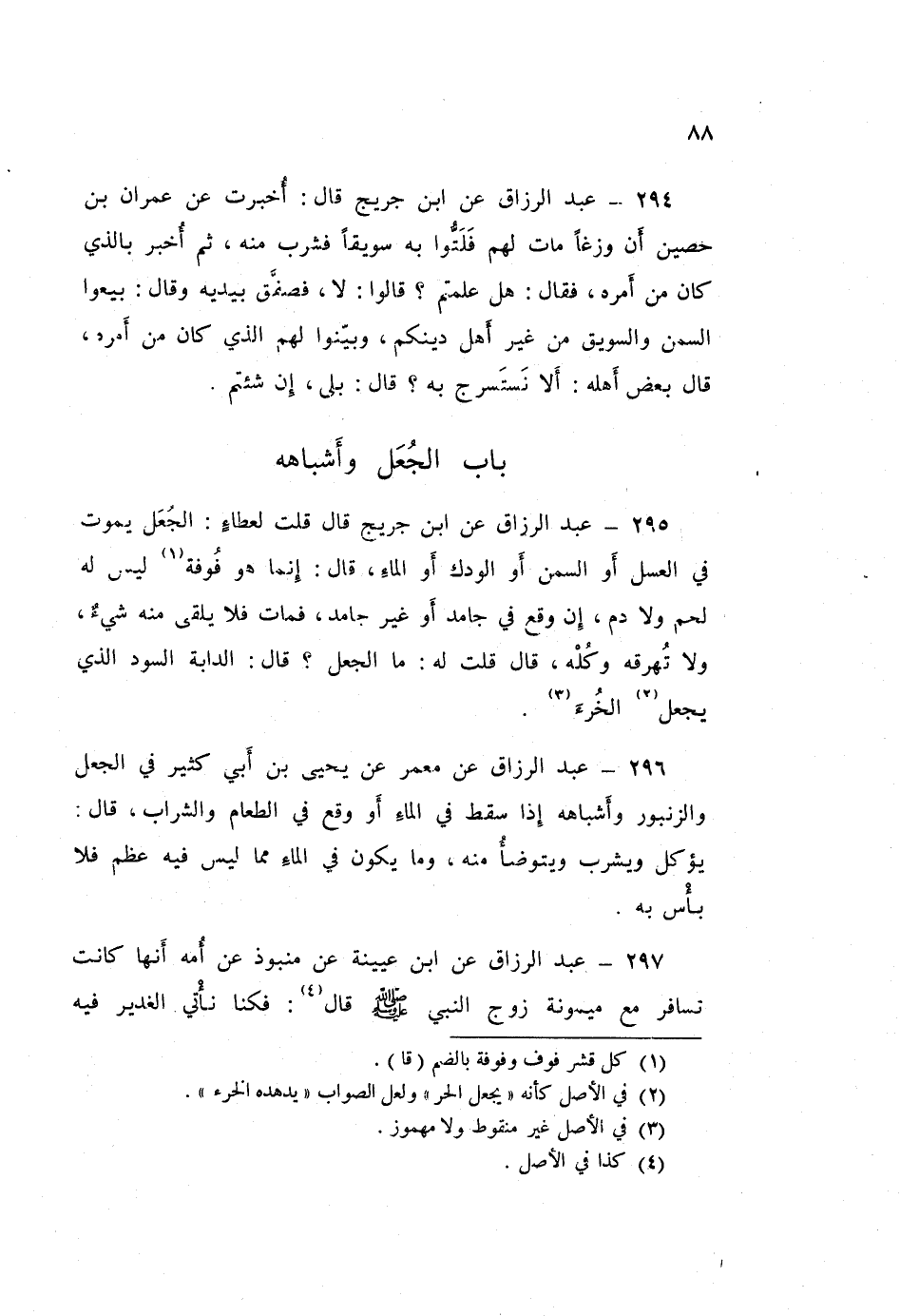 295 - عَبْدُ الرَّزَّاقِ، عَنِ ابْنِ جُرَيْجٍ قَالَ: قُلْتُ لِعَطَاءٍ: الْجُعَلُ يَمُوتُ فِي الْعَسَلِ، أَوِ السَّمْنِ، أَوِ الْوَدَكِ، أَوِ الْمَاءِ قَالَ: «§إِنَّمَا هُوَ فُوفَةٌ لَيْسَ لَهُ لَحْمٌ وَلَا دَمٌ، إِنْ وَقَعَ فِي جَامِدٍ أَوْ غَيْرِ جَامِدٍ فَمَاتَ فَلَا يُلْقَى مِنْهُ شَيْءٌ، وَلَا تُهْرِقْهُ وَكُلْهُ» قَالَ: قُلْتُ لَهُ: مَا الْجُعَلُ؟ قَالَ: «الدَّابَّةُ السُّودُ الَّذِي يَجْعَلُ الْخُرْءَ»