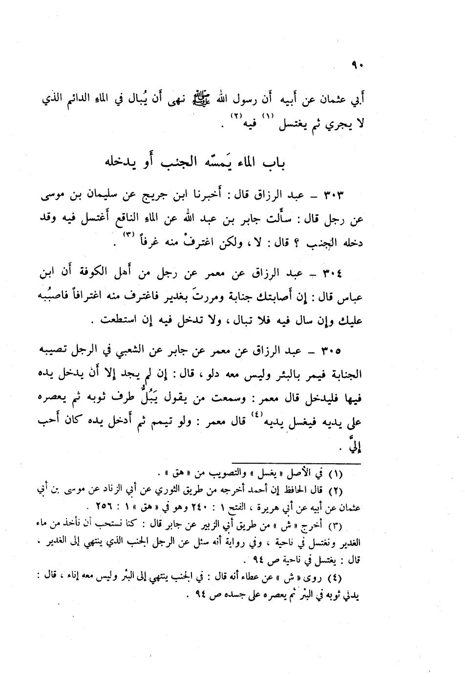 303 - عَبْدُ الرَّزَّاقِ قَالَ: أَخْبَرَنَا ابْنُ جُرَيْجٍ، عَنْ سُلَيْمَانَ بْنِ مُوسَى، عَنْ رَجُلٍ قَالَ: سَأَلْتُ جَابِرَ بْنَ عَبْدِ اللَّهِ عَنِ الْمَاءِ النَّاقِعِ، أَغْتَسِلُ فِيهِ وَقَدْ دَخَلَهُ الْجُنُبُ قَالَ: «لَا وَلَكِنِ §اغْتَرِفْ مِنْهُ غَرْفًا»